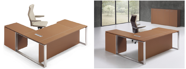 ※ 上图为大班台不同角度的展示,精湛的做工,皮革台面,不锈钢拉丝脚架,搭配出清爽的办公环境!