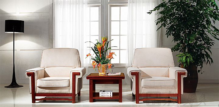 ※ 上图为类似款接待沙发的使用场景展示图,布面扶手,实木骨骼架,四脚沙发,简洁,舒适,但是也不乏厚实稳重!