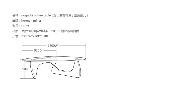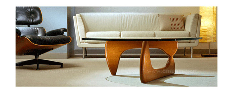 "日裔美国人野口勇(Isamu Noguchi,1904-1988年)是20世纪著名的批判性学院派雕塑家之一,是最早尝试将雕塑和景观设计结合的人,他的设计将东方的空间美学,融入到西方的现代理性当中,充满了传统和现代融合的大胆创新。野口勇设计的著名家具——Noguchi Coffee Table (野口勇咖啡桌/三角茶几)是以其独特的设计和广泛的适用性至今还深受人们欢迎。1948年,日本裔设计师野口勇设计了这张闻名于世的野口勇咖啡桌。雕塑般桌脚由实木制成,配上水滴状的玻璃桌面却能产生一种化学反应。这就是它在60年后,仍是最热的畅销品的原因。咖啡桌的由ABS/实木桌脚(水曲柳/桦木),可选黑色、原木色、胡桃木色,钢化玻璃桌面,结构稳定,不会摆动。"
