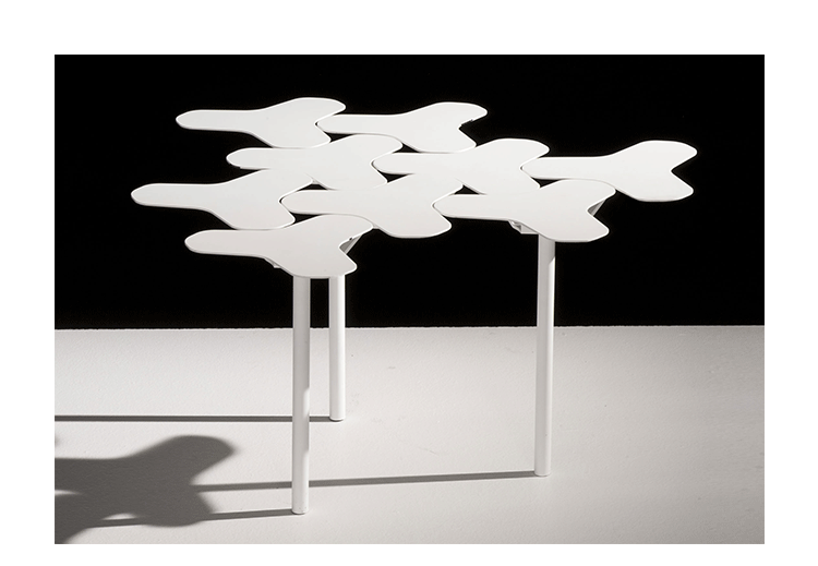 Nanook系列是由瑞士设计师Philippe Bestenheider于今年为意大利Moroso设计,并在今年的米兰家具展上进行了展出。Nanook系列包括一把凳子、一把椅子和一张角桌。该系列作品表现了平面到三维世界的转变。凳子和椅子的六边形网状结构的灵感来自于分子几何学。Nanook系列以铸模成形的合成材料作为基本框架,而其座椅部分的表面织物上则进行了打褶和印刷处理,使其看上去有动物皮肤的紧致感。如同因纽特人用动物皮毛取暖一样,作者试图用这种方式唤起人们深处的记忆,而他的创作灵感也源自遥远的北极。Nanook系列的桌子和凳子看上去更像是雕塑而不是家具。设计师源自分子结构的灵感让人们感觉该系列更加独特,尤其是多张桌子并排放置时,产生的效果就像一片静静矗立的风车。而有靠背的椅子则更像是一片被折叠的五彩雪花,令人犹如置身于神秘的北极。