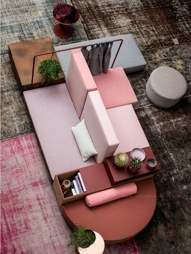 设计相互作用,轨迹控制空间。比基尼是一种风景,它是时代的产物,是它所代表的社会。无论是在等候区还是在家中使用,座位系统是绝对灵活的,因为不需要空间的布局和座位组件的排列。这些组件在外观和功能上各不相同,因此,它们可以在任何设置中使用。凳子、桌子、衣架、容器、架子、屏风、工作台、座椅:每一个元素都结合在一起,创造互动和交流。多种功能和含义的结合意味着沙发作为看电视的家具或简单的休息场所的概念发生了革命性的变化,使它成为互动的核心。