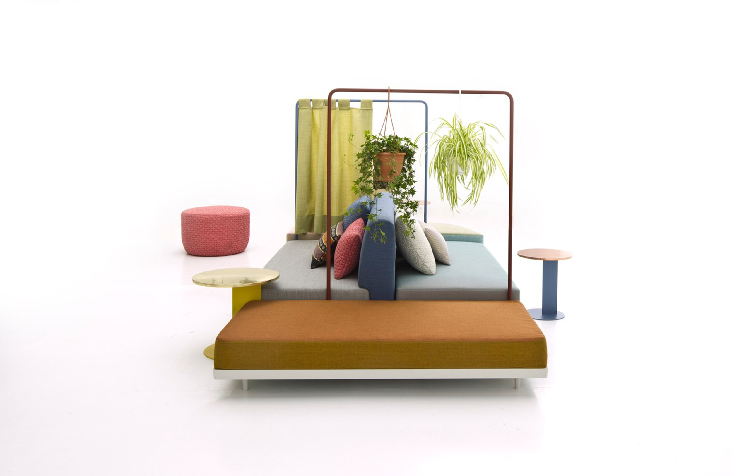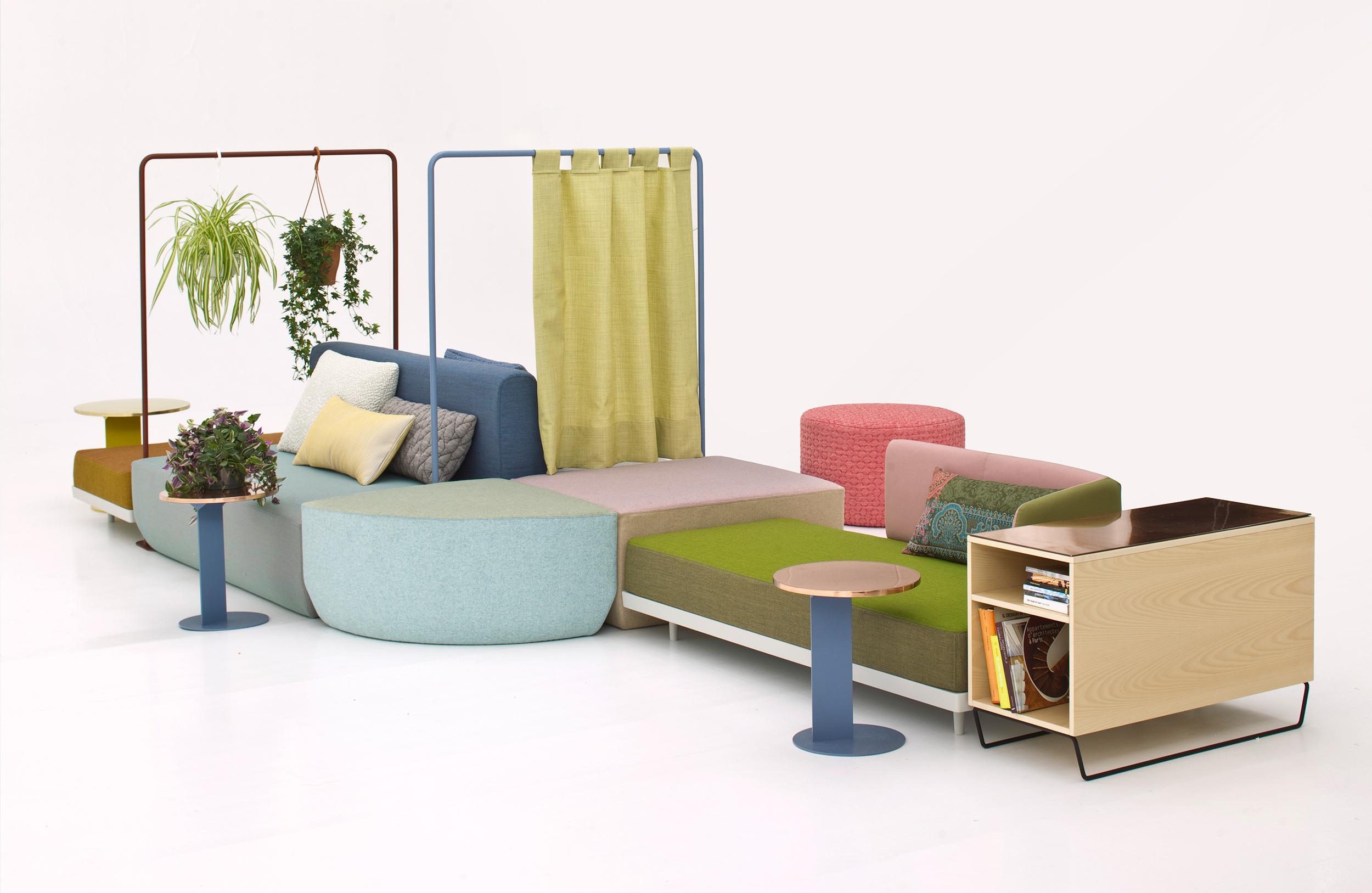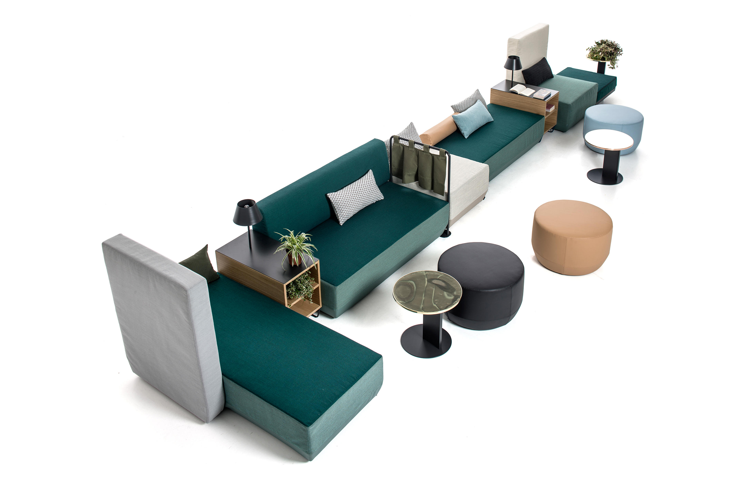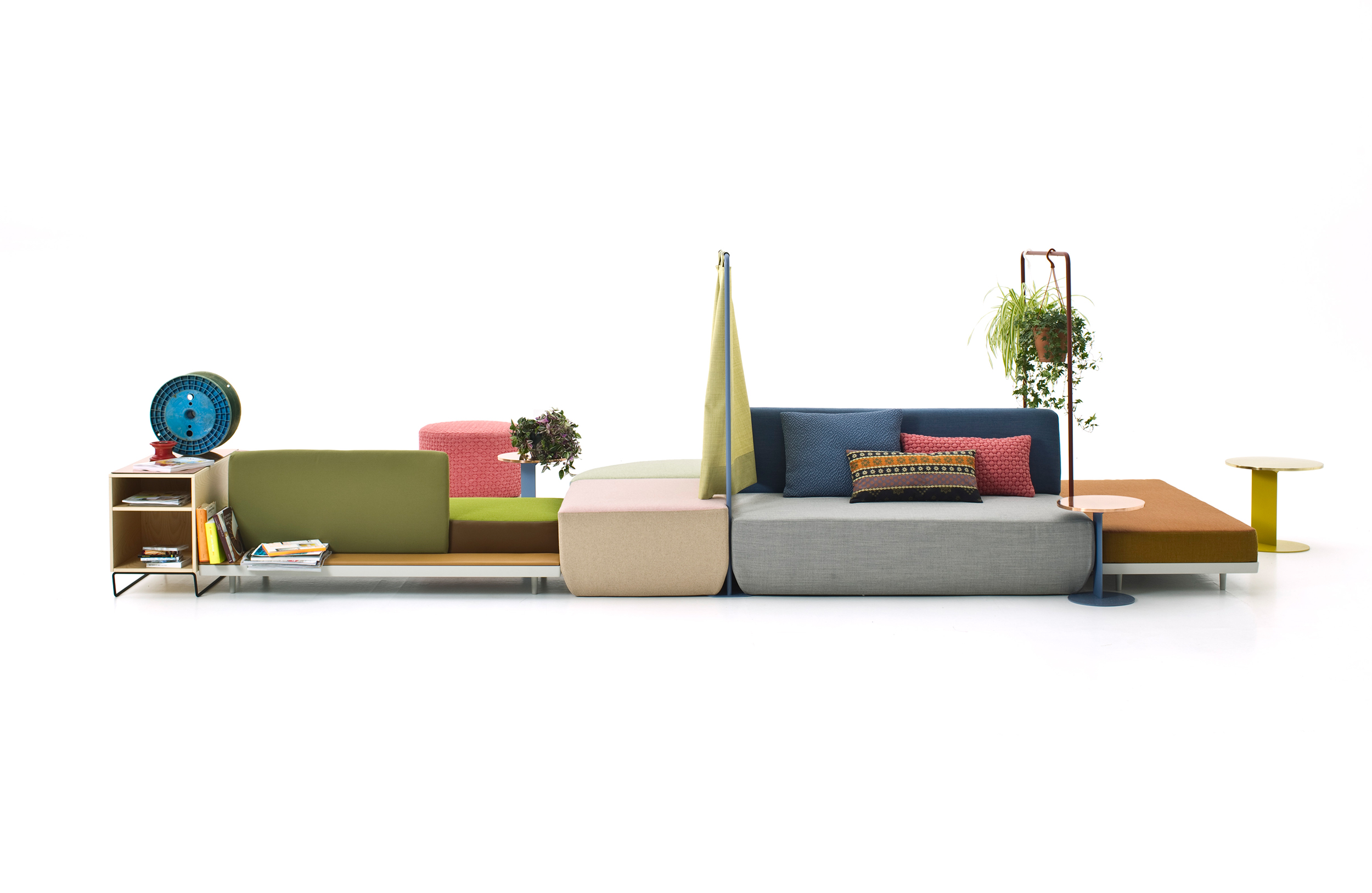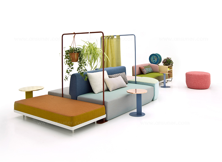 设计相互作用,轨迹控制空间。比基尼是一种风景,它是时代的产物,是它所代表的社会。无论是在等候区还是在家中使用,座位系统是绝对灵活的,因为不需要空间的布局和座位组件的排列。这些组件在外观和功能上各不相同,因此,它们可以在任何设置中使用。凳子、桌子、衣架、容器、架子、屏风、工作台、座椅:每一个元素都结合在一起,创造互动和交流。多种功能和含义的结合意味着沙发作为看电视的家具或简单的休息场所的概念发生了革命性的变化,使它成为互动的核心。