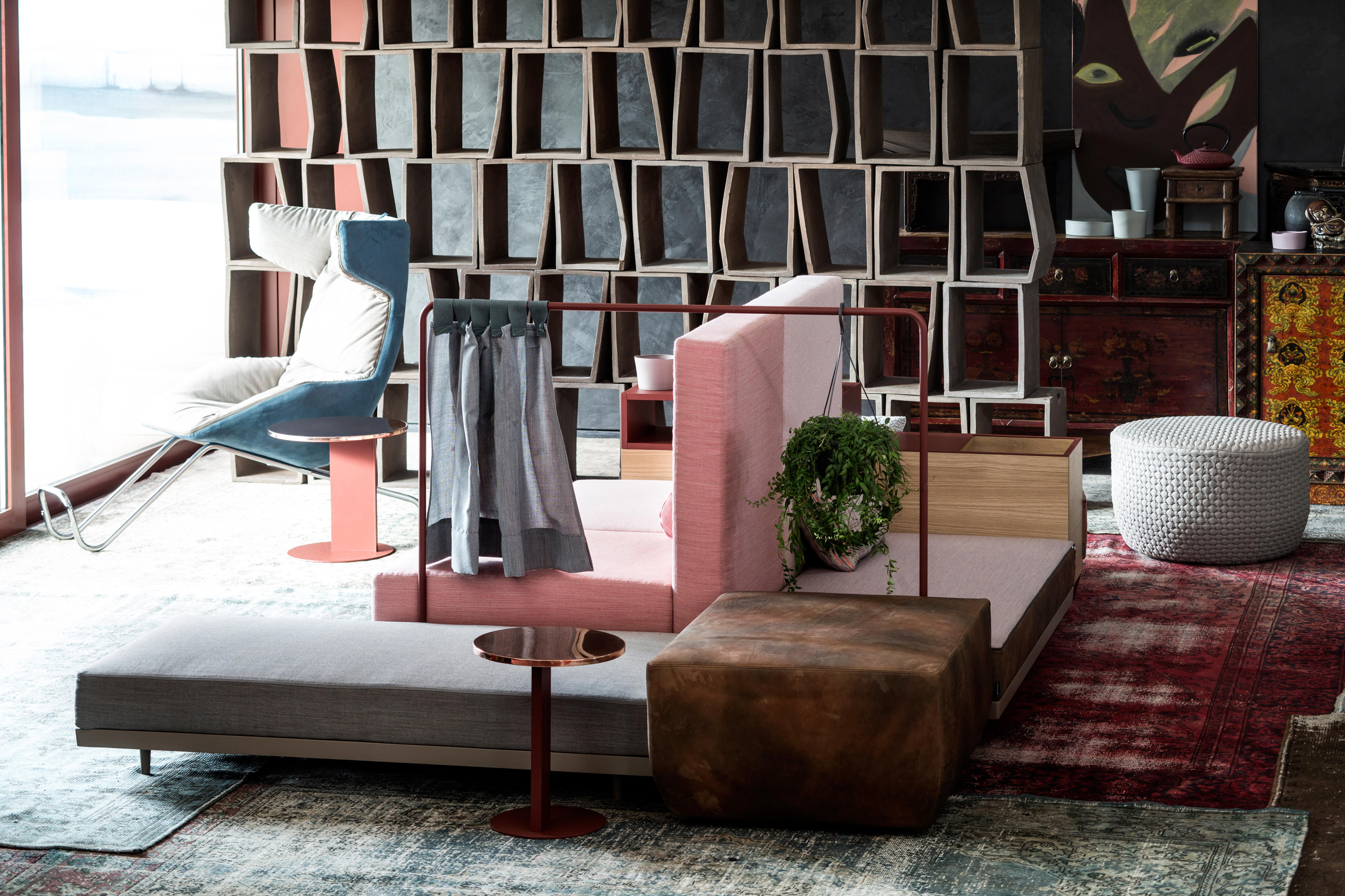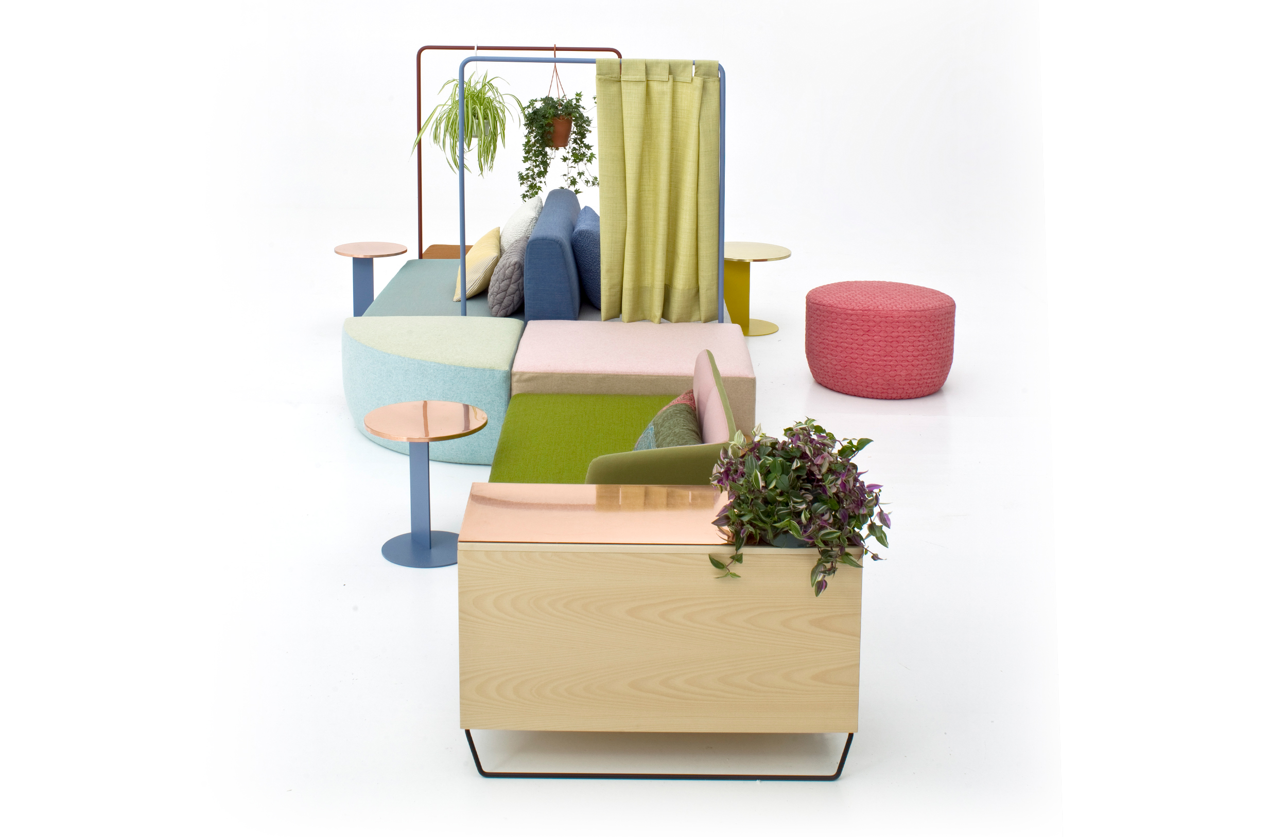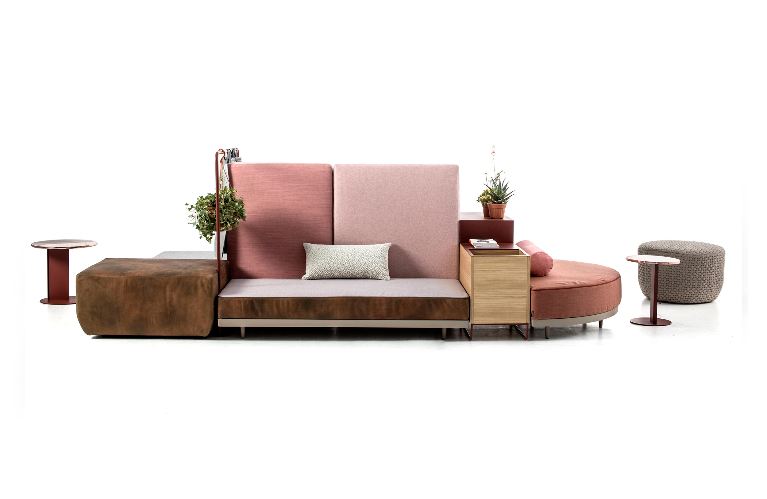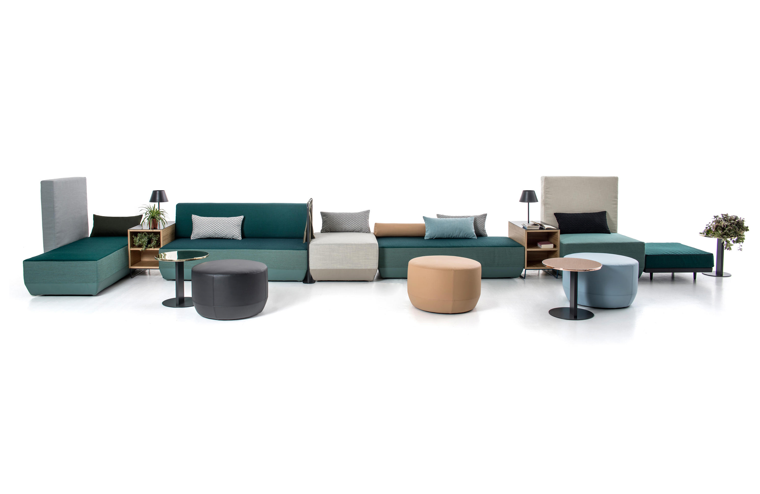 设计相互作用,轨迹控制空间。比基尼是一种风景,它是时代的产物,是它所代表的社会。无论是在等候区还是在家中使用,座位系统是绝对灵活的,因为不需要空间的布局和座位组件的排列。这些组件在外观和功能上各不相同,因此,它们可以在任何设置中使用。凳子、桌子、衣架、容器、架子、屏风、工作台、座椅:每一个元素都结合在一起,创造互动和交流。多种功能和含义的结合意味着沙发作为看电视的家具或简单的休息场所的概念发生了革命性的变化,使它成为互动的核心。