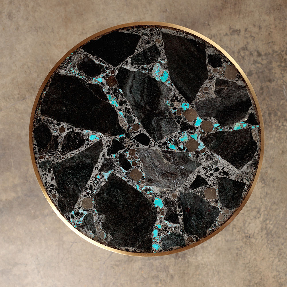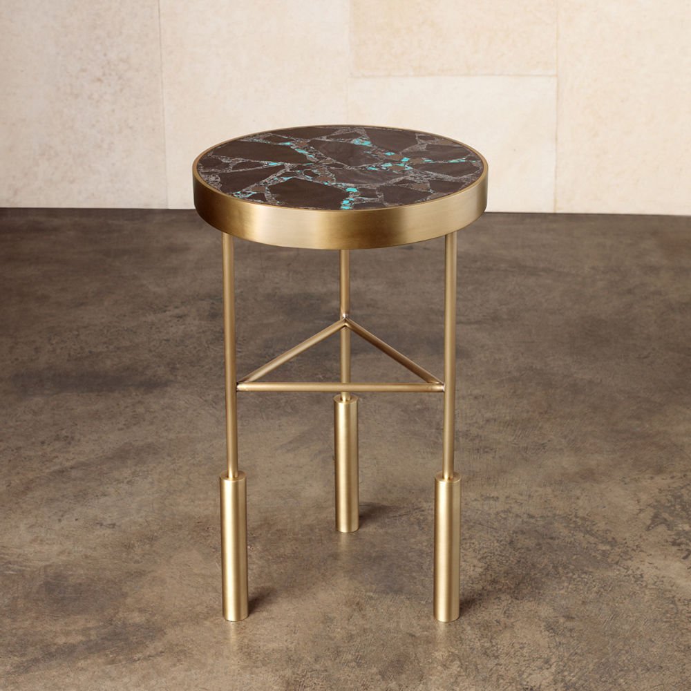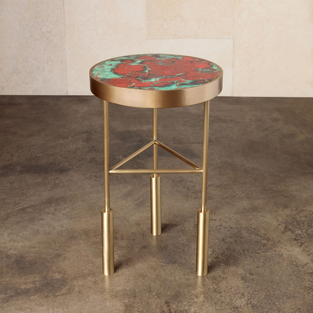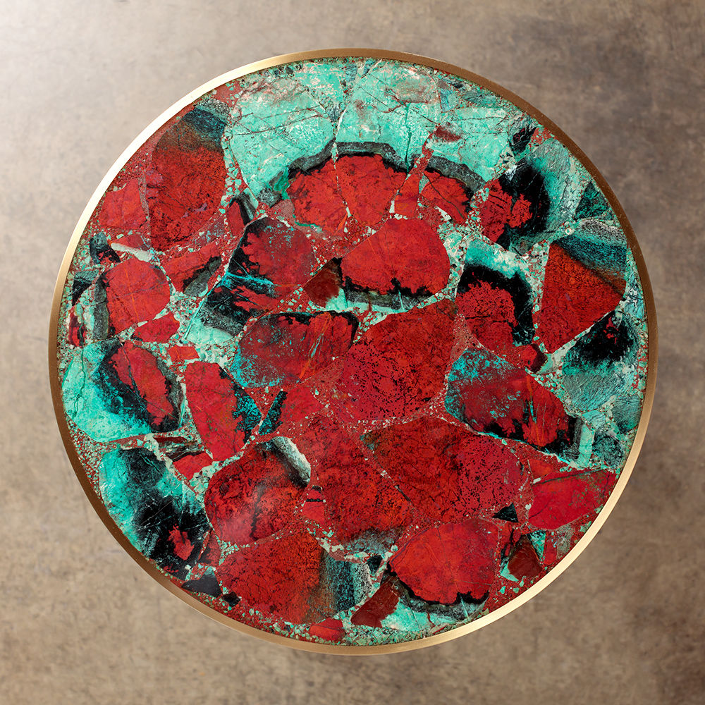 Sedona Side Table(塞多纳边几)有一系列镶嵌和抛光的半宝石,如玫瑰石英的菱锰矿,以及抛光黄铜框架的绿松石云母板岩。 每件作品都是独一无二。