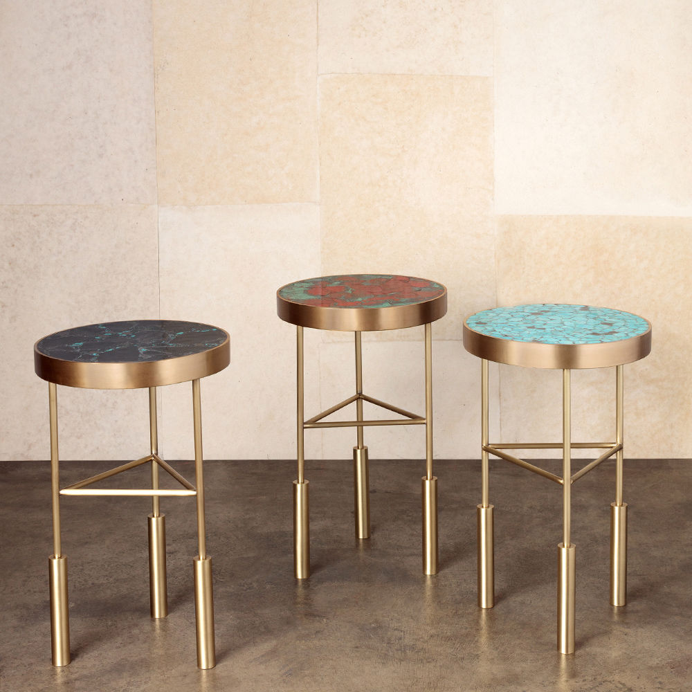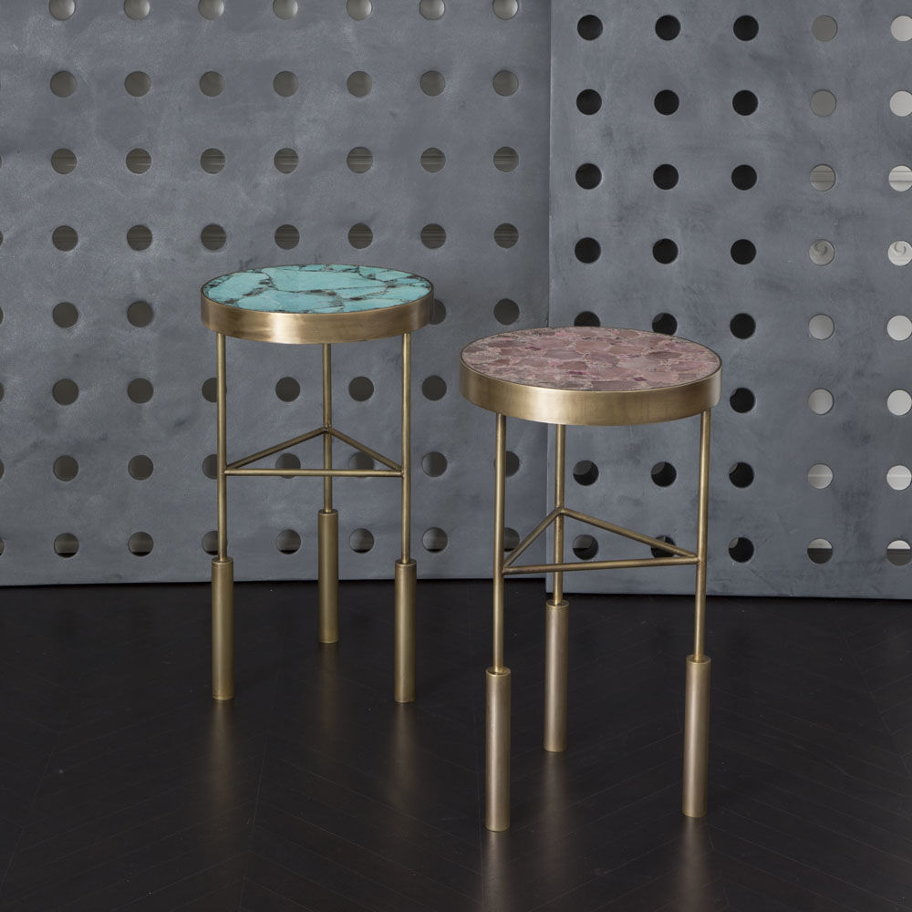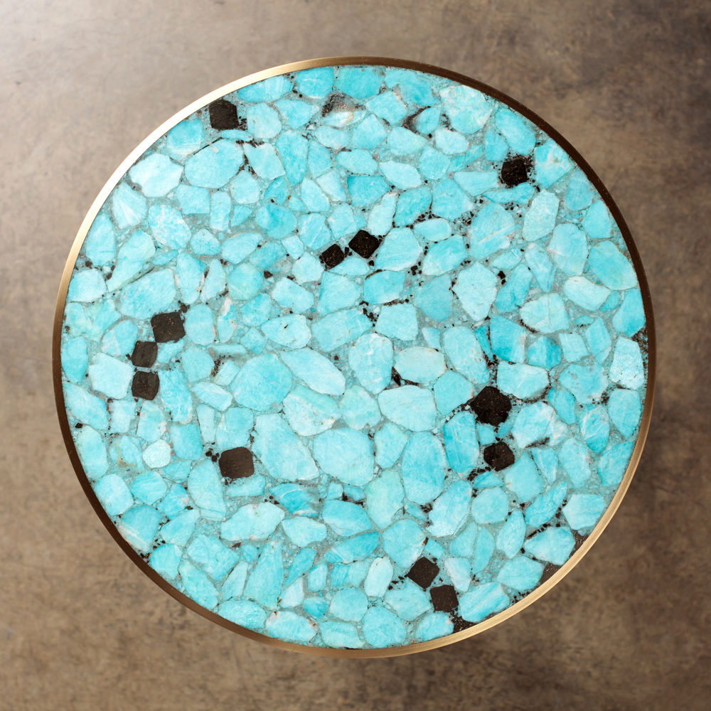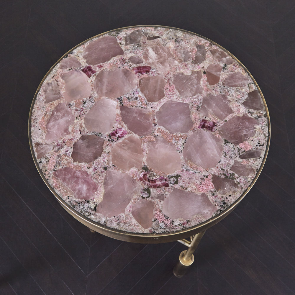 Sedona Side Table(塞多纳边几)有一系列镶嵌和抛光的半宝石,如玫瑰石英的菱锰矿,以及抛光黄铜框架的绿松石云母板岩。 每件作品都是独一无二。