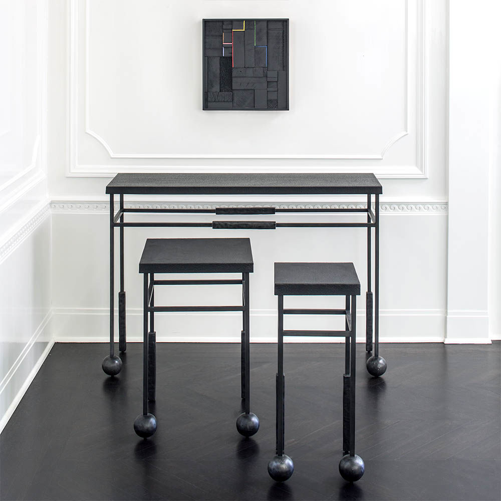 雕塑般的尼姆控制台采用黑色不锈钢制成,具有细长,光滑的铸造方形细高跟腿,手工雕刻铸钢球体和黑色花岗岩顶部。