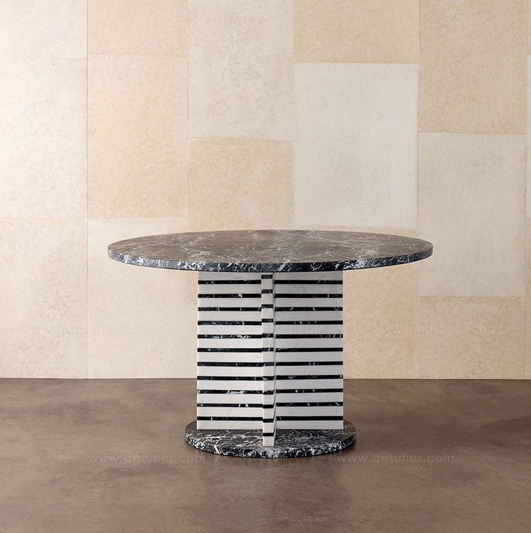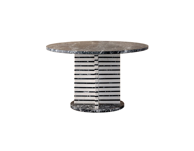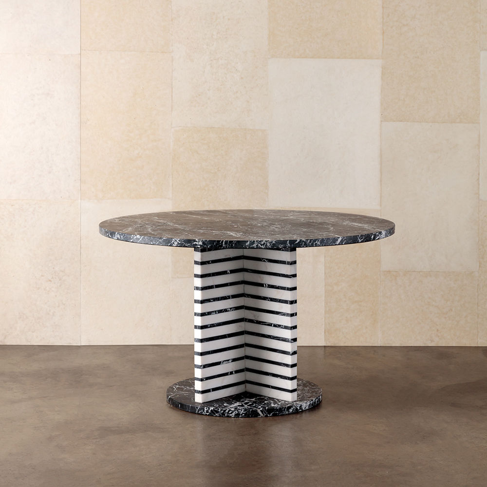 Lineage餐桌融合了混合大理石和建筑构造形式,体现了艺术与功能的现代二元性。 这款雕塑餐桌采用交替的天然黑色玛奎那和白色大理石层,并经过磨光处理。