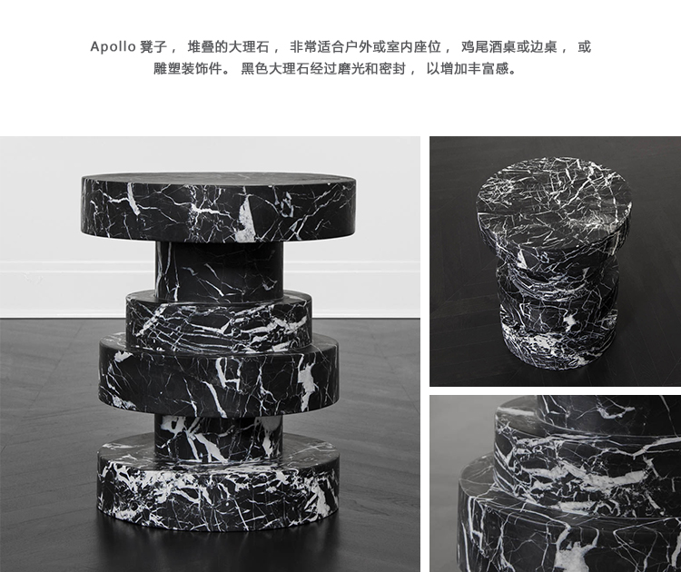 Apollo凳子,堆叠的大理石,非常适合户外或室内座位,鸡尾酒桌或边桌,或雕塑装饰件。 黑色大理石经过磨光和密封,以增加丰富感。
