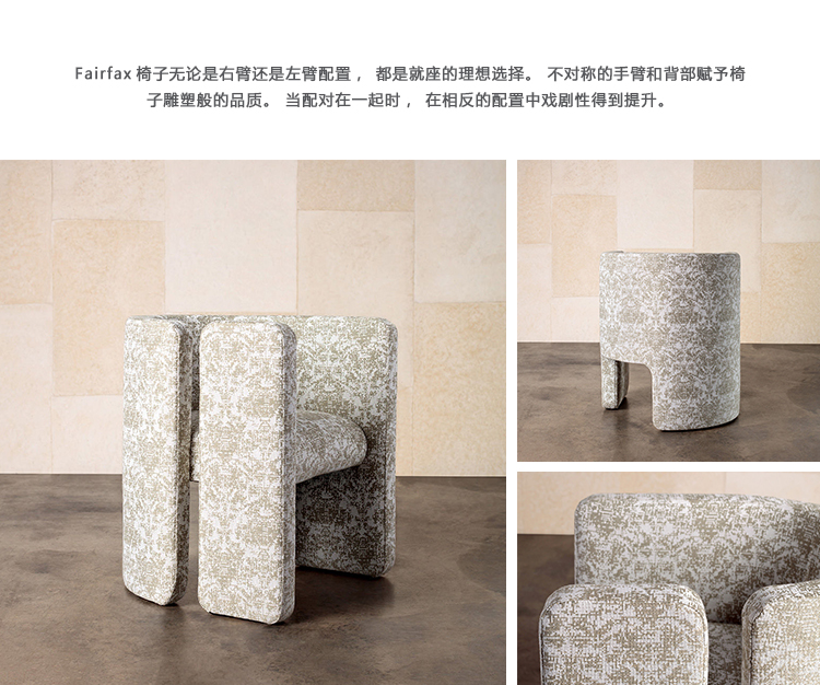 Fairfax椅子无论是右臂还是左臂配置,都是偶尔就座的理想选择。 不对称的手臂和背部赋予椅子雕塑般的品质。 当配对在一起时,在相反的配置中戏剧性得到提升。 硬木框架采用双层细木工制成,可延长使用寿命。 提供精选的精选面料和皮革。
