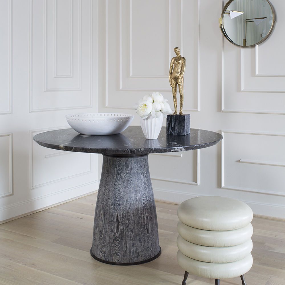 Camden Table由坚固的金属丝拉丝文格底座和黄铜底座以及抛光青铜色组成,融合了Kelly对原始,有机材质和经典款式的亲和力。 顶部是经过磨光和密封的宇宙黑色大理石的反转斜边,带有黑色的青铜边缘。 顶部还有白色Venatino石头和拉丝橡木。