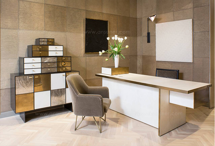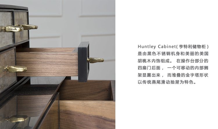 Huntley Cabinet(亨特利柜)是由黑色不锈钢机身和美丽的美国胡桃木内饰组成。在操作台部分的四扇门后面,一个可移动的内部搁架显露出来,而堆叠的金字塔形状以传统燕尾滑动抽屉为特色。 白色羊皮纸,手工制作的透明种子玻璃,古董镜子和抛光青铜,抽屉和门前面交替,全部装饰有手工雕刻的拉链。