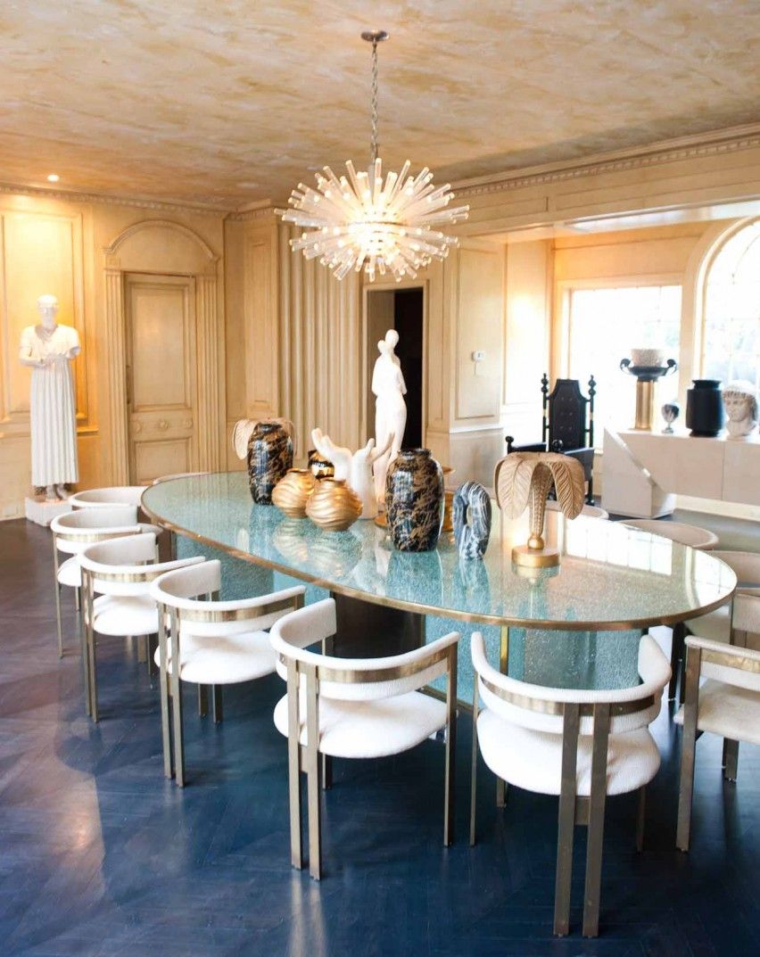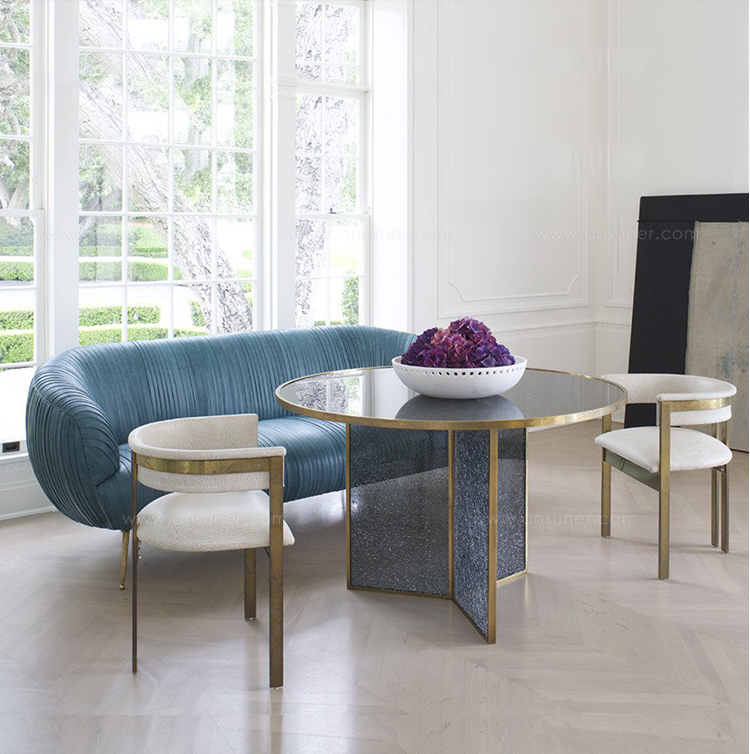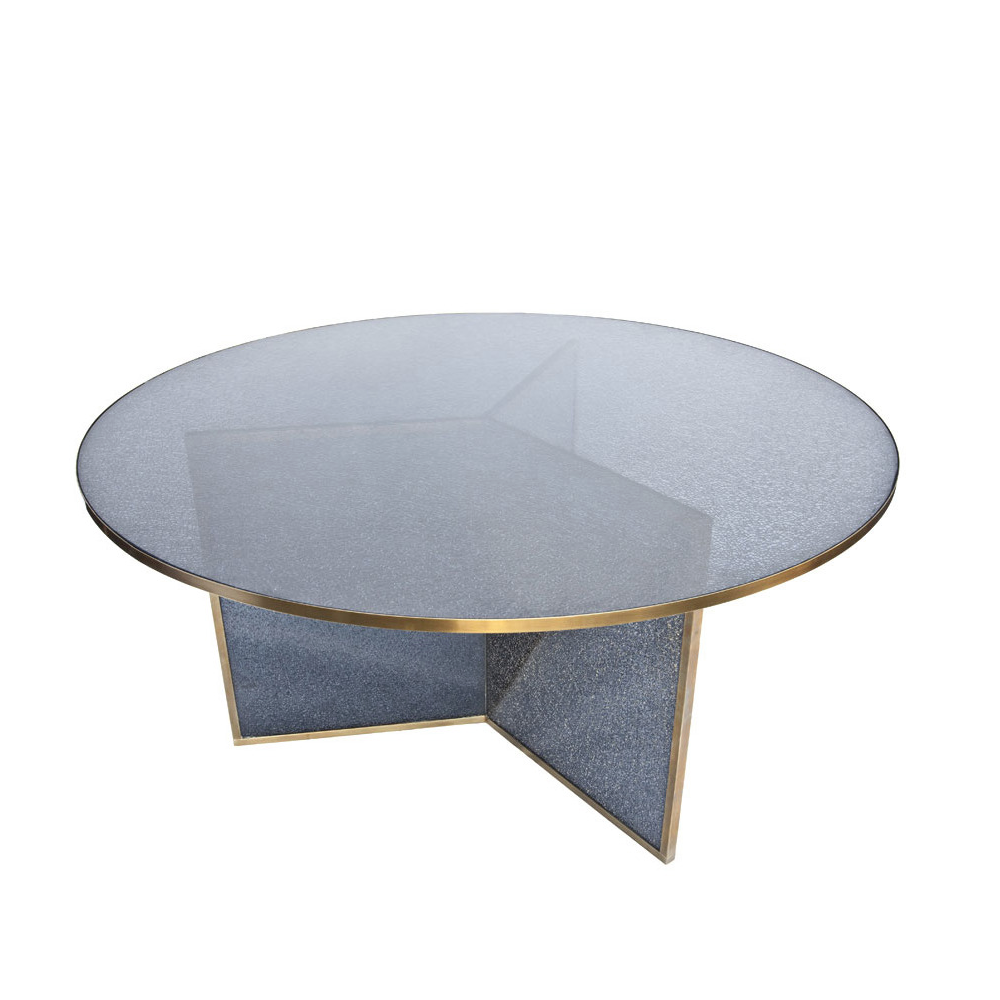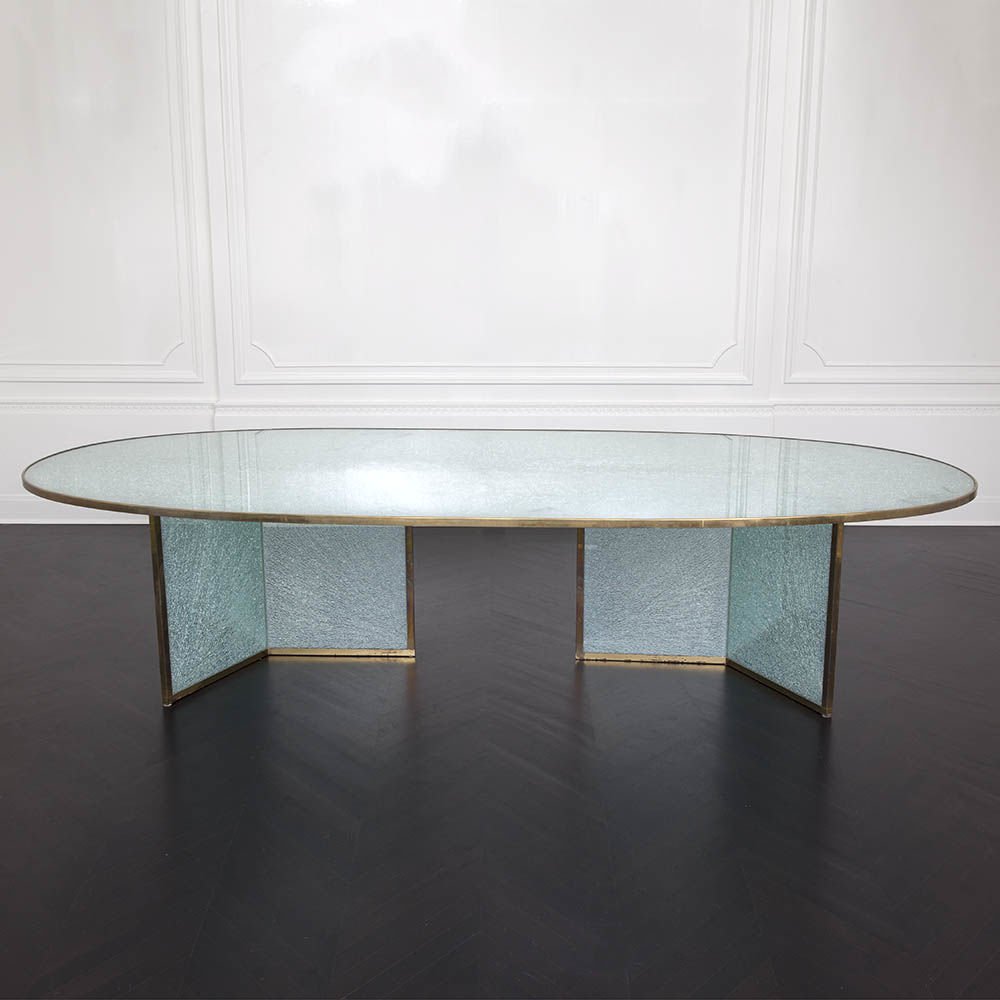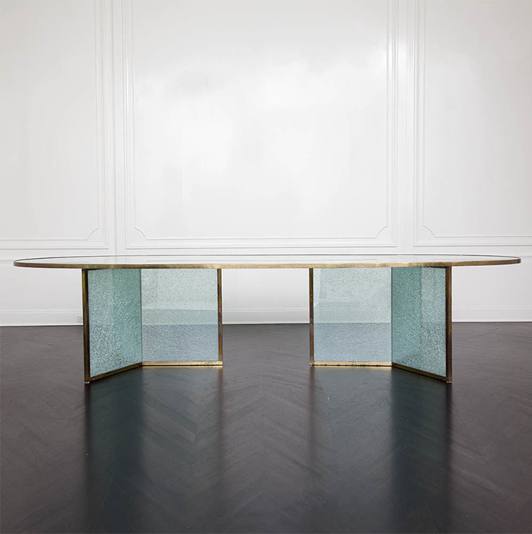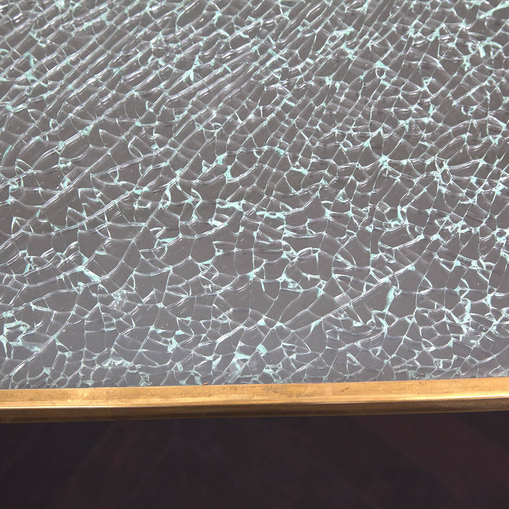 这款引人注目的现代餐桌拥有精美的纹理,融合了原始和精致的元素。 每块钢化玻璃都是手工破碎的,创造了材料的并置与优雅的古董黄铜封边条。