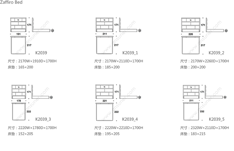 Zaffiro Bed 系列尺寸/示意图