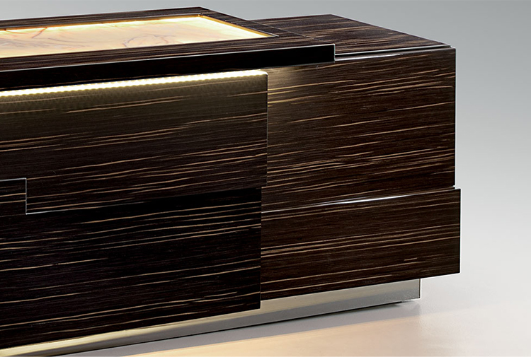 FRAME / SHUTTERS Wood veneered Ebony Macassar, Erable or lacquered with glossy lacquered brushed finishing. Wooden coplanar shutters coordinated with the frame