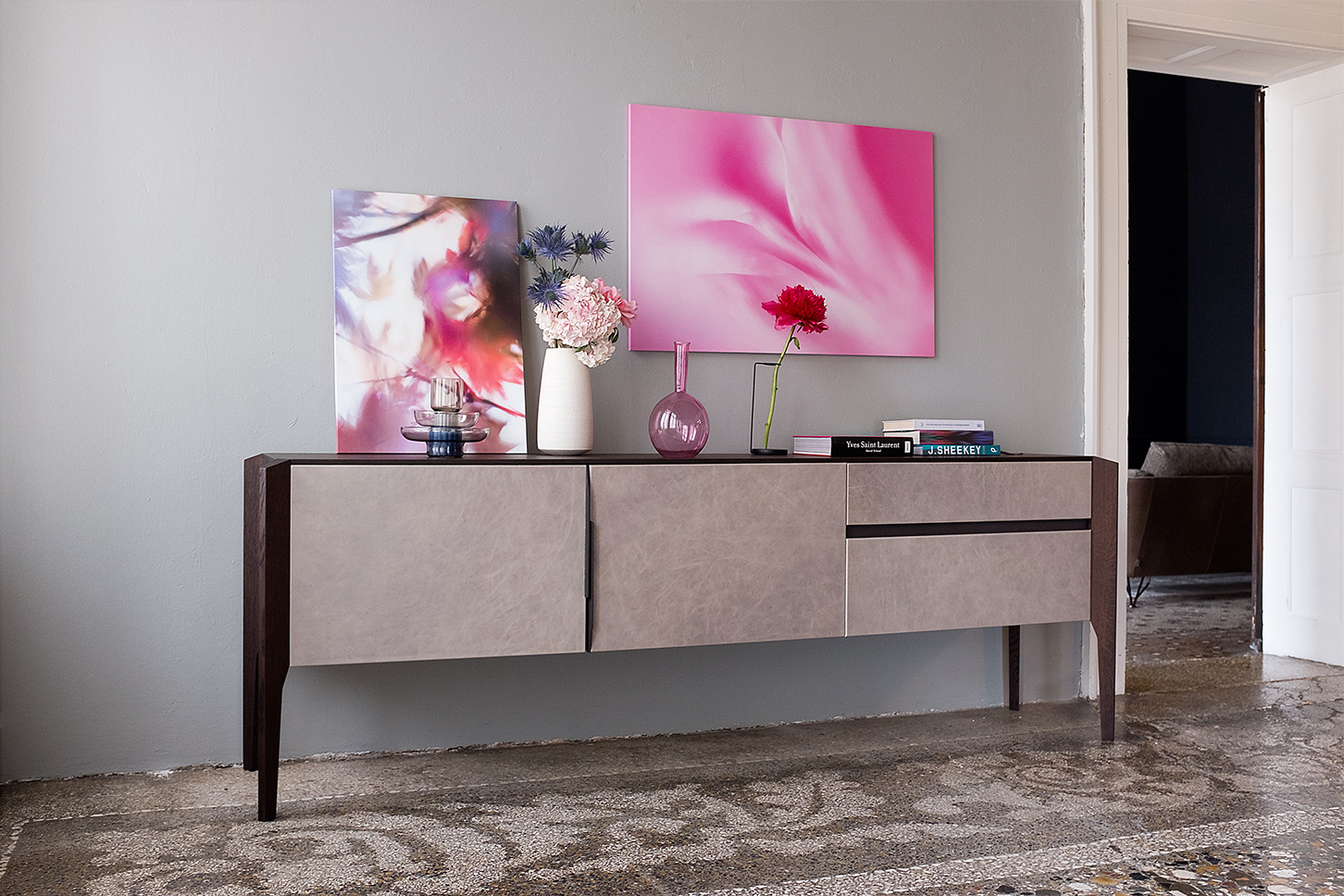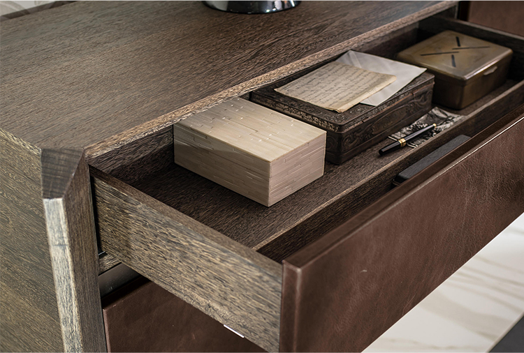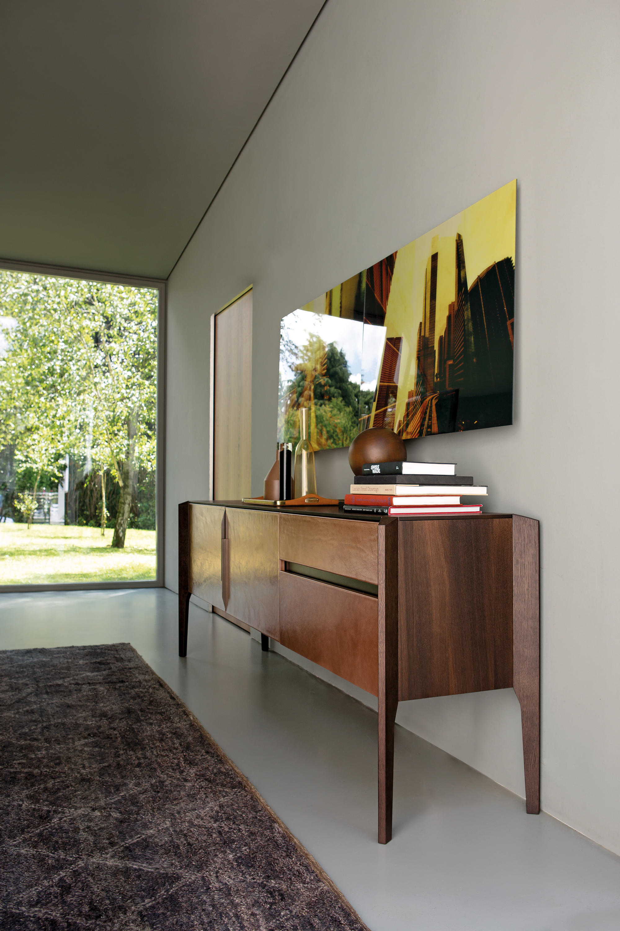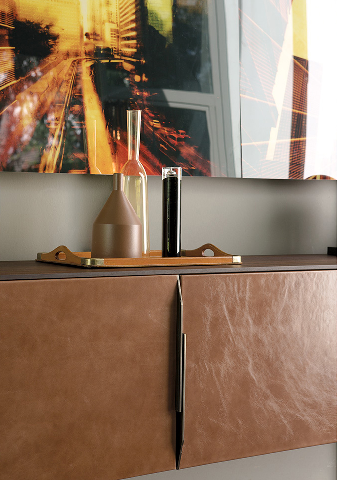 完成最低生活的家具, 但也为一个更经典的住宿, 是由 Manzoni 和 Tapinassi 的荣耀餐具柜, 在莫卡, 卡纳莱托核桃或 Sucupira, 用金属零件涂在云母颜色或镀锌钛, 与印记很纯洁门和抽屉可以用植物皮革覆盖。