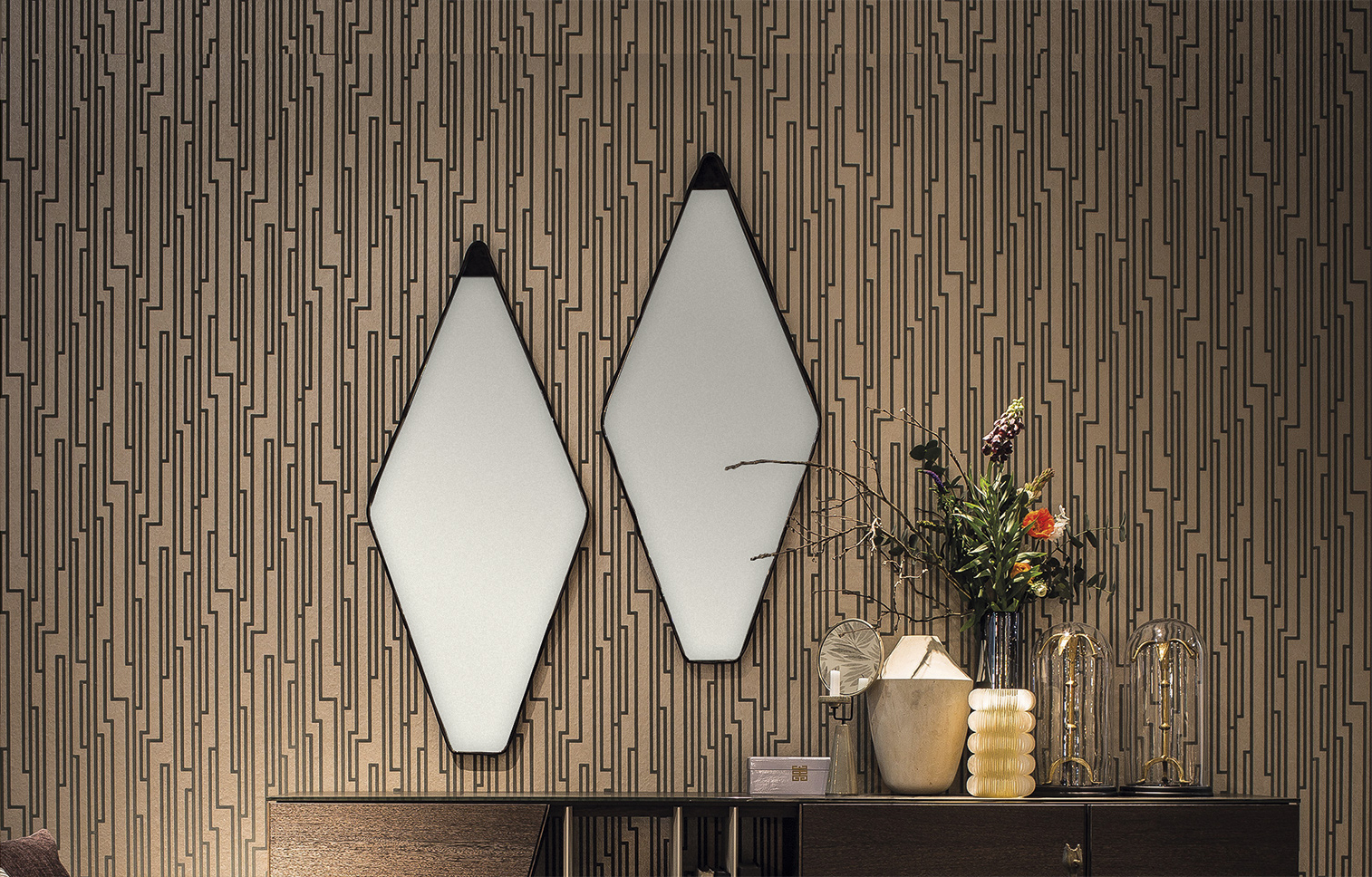 Gino Carollo设计的《名利场》(Vanity Fair)由镜子或烟熏玻璃制成。它以丝绒或皮革制成罩盖提供了一种严谨的精度和美感的效果,并与简单的菱形线形成对比。镜子可以是单、双、三、甚至是将模块并排放置在墙上。