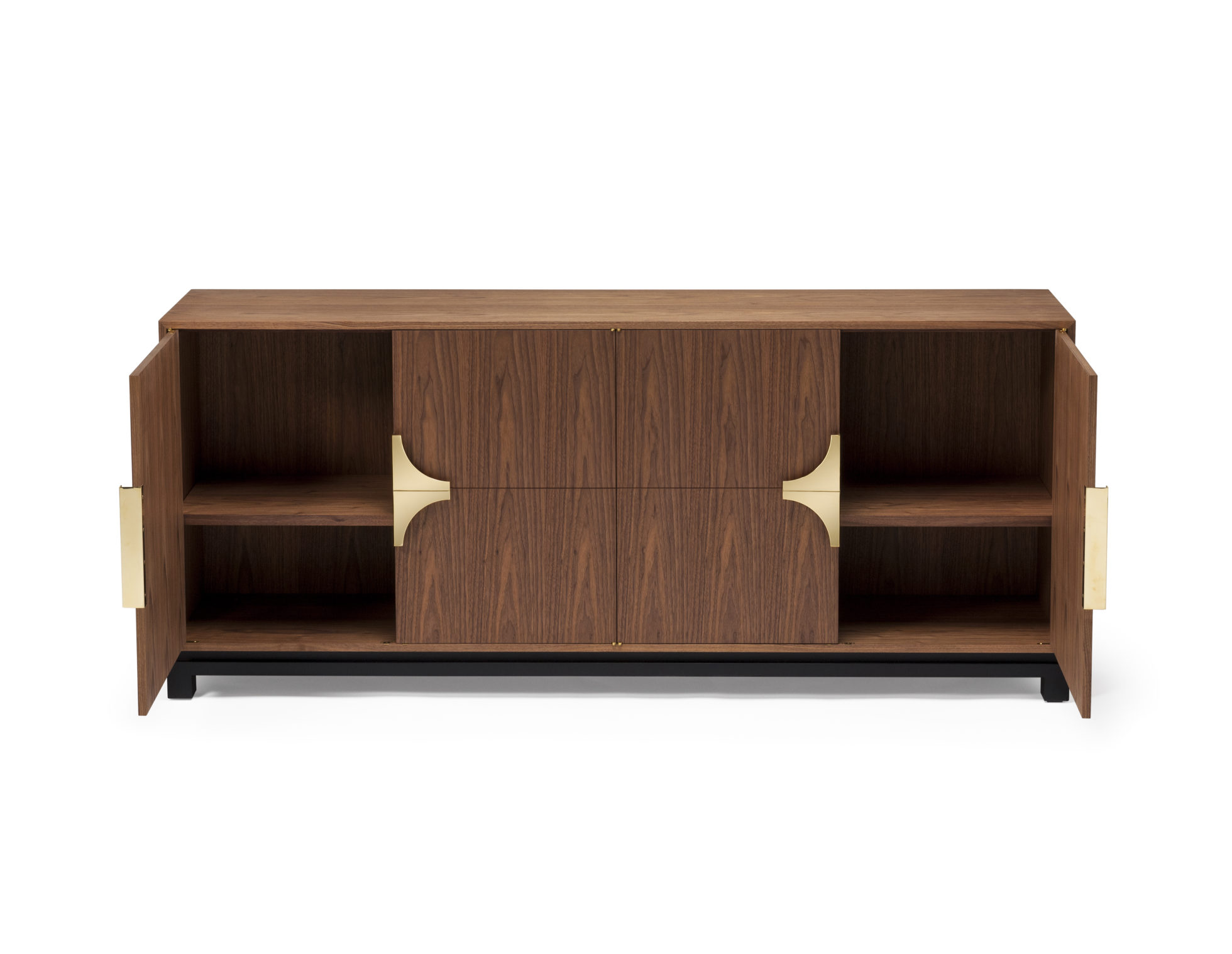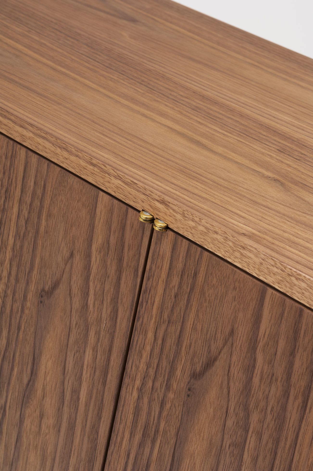这款庄严的餐具柜配有经典的偏置枢轴铰链,子弹头和定制的黄铜手柄。