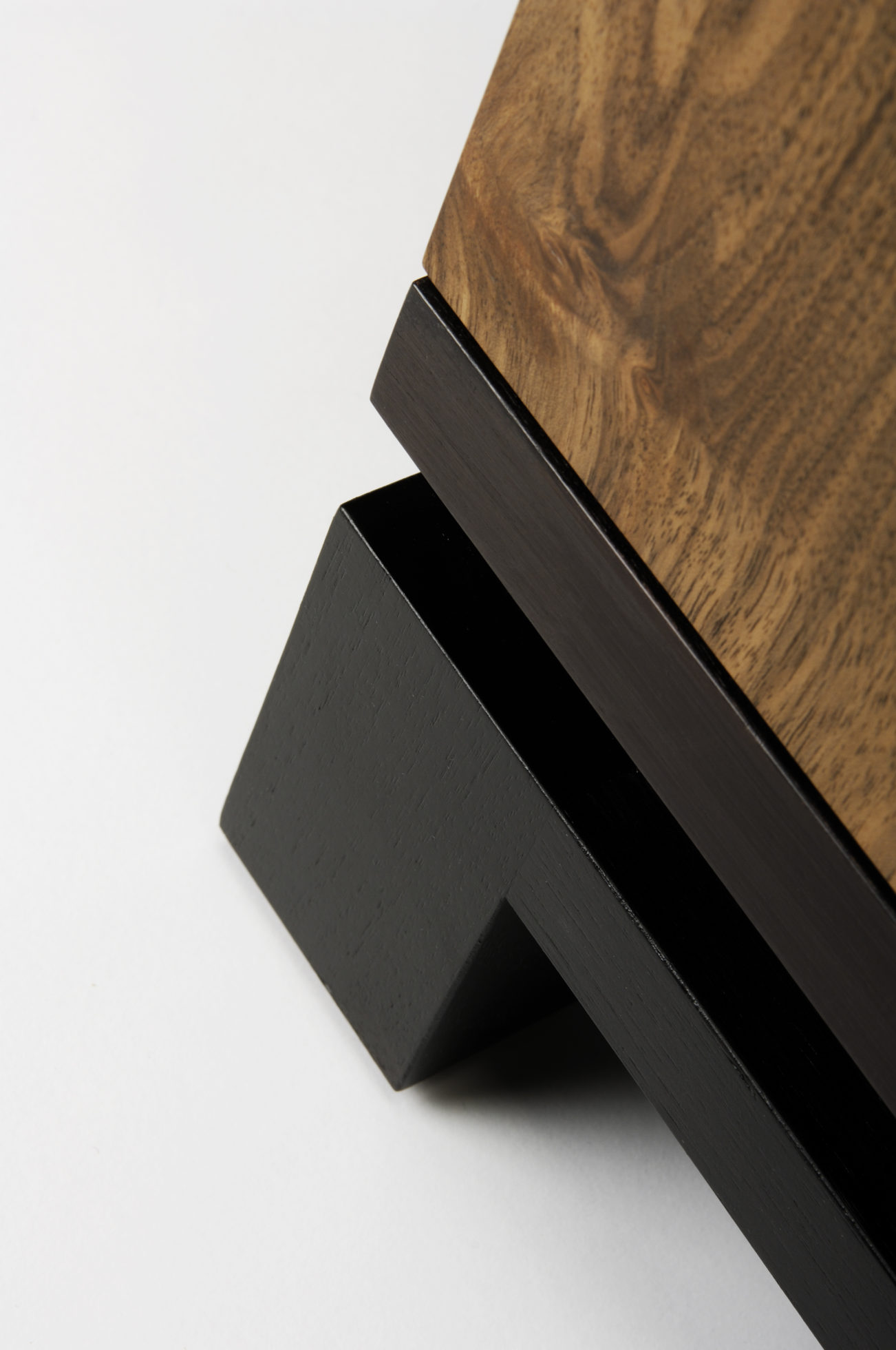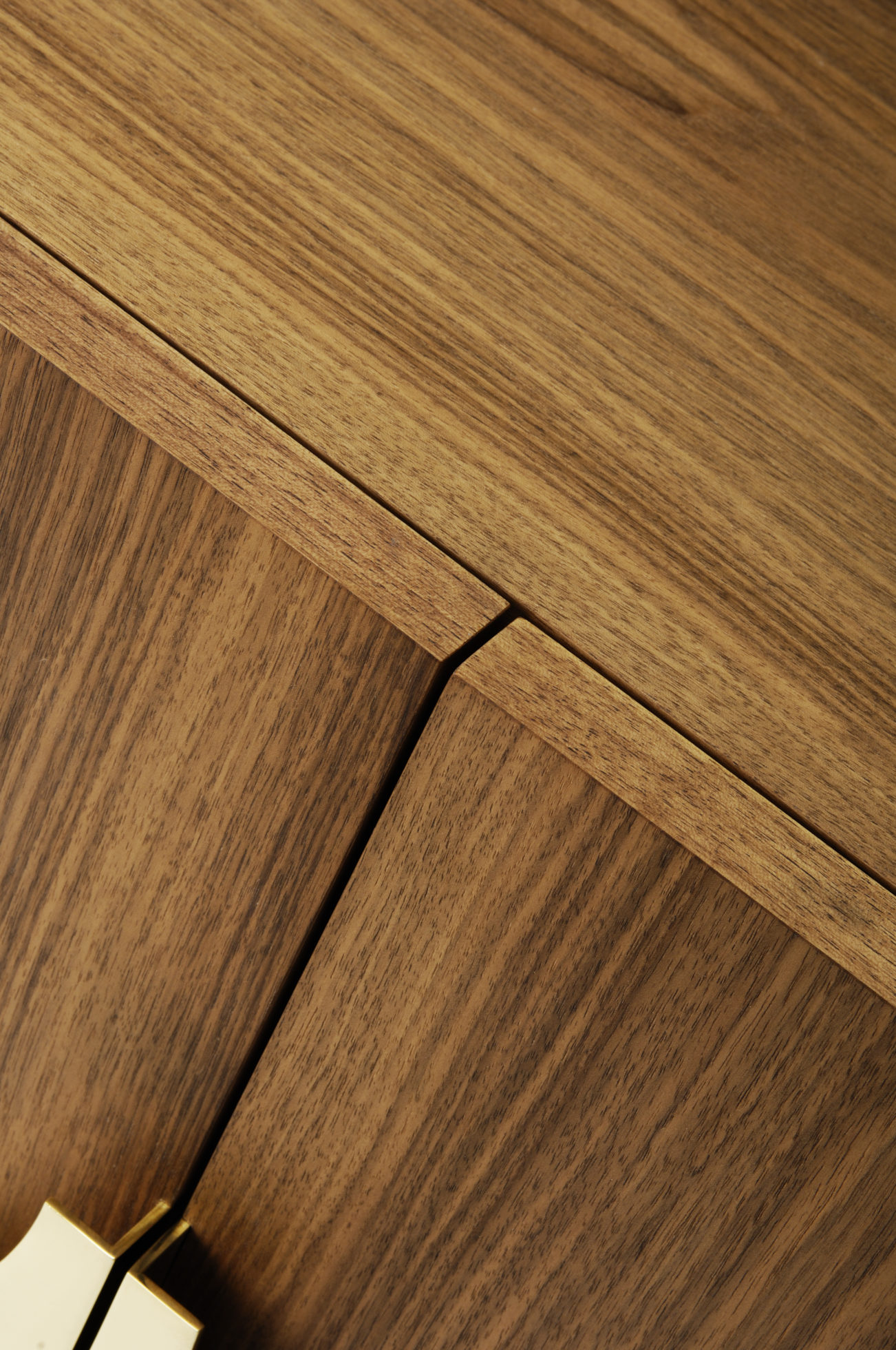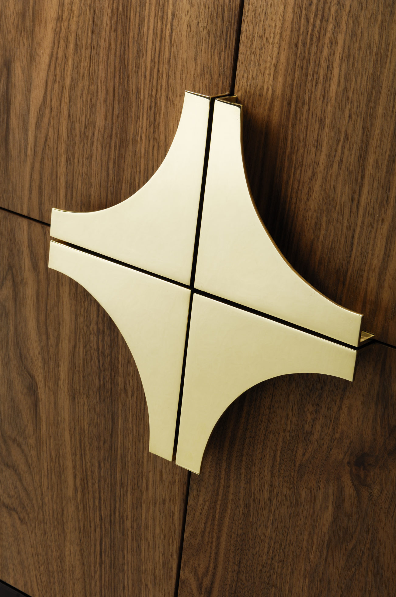 这款小巧的内阁采用美国黑胡桃天然涂油灯和黑色乌木缎底设计而成。 大型定制弧形实心黄铜手柄环绕四扇门。