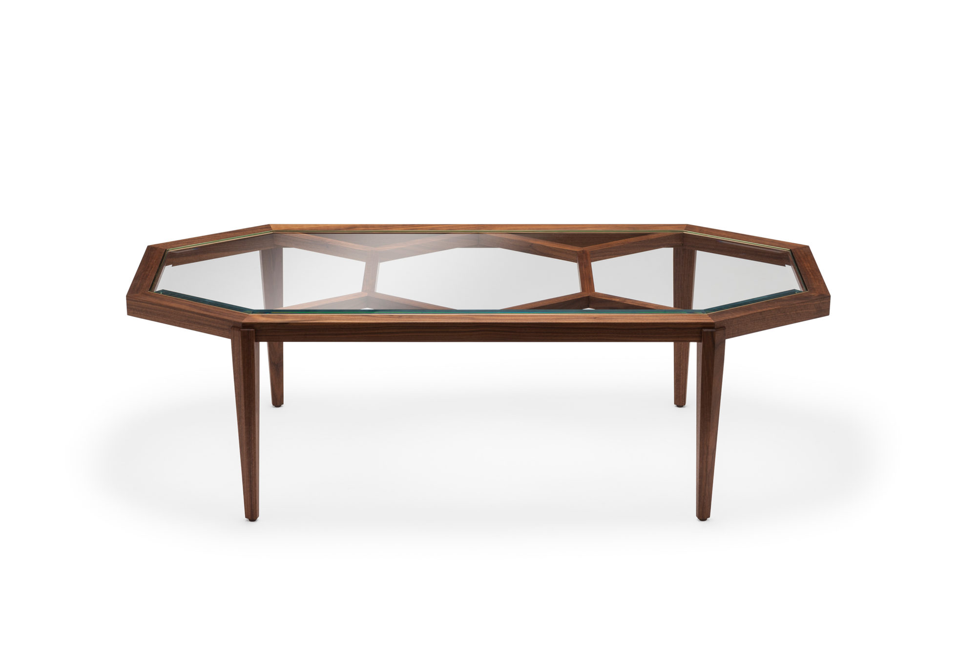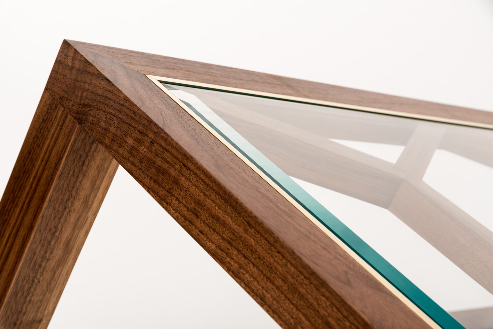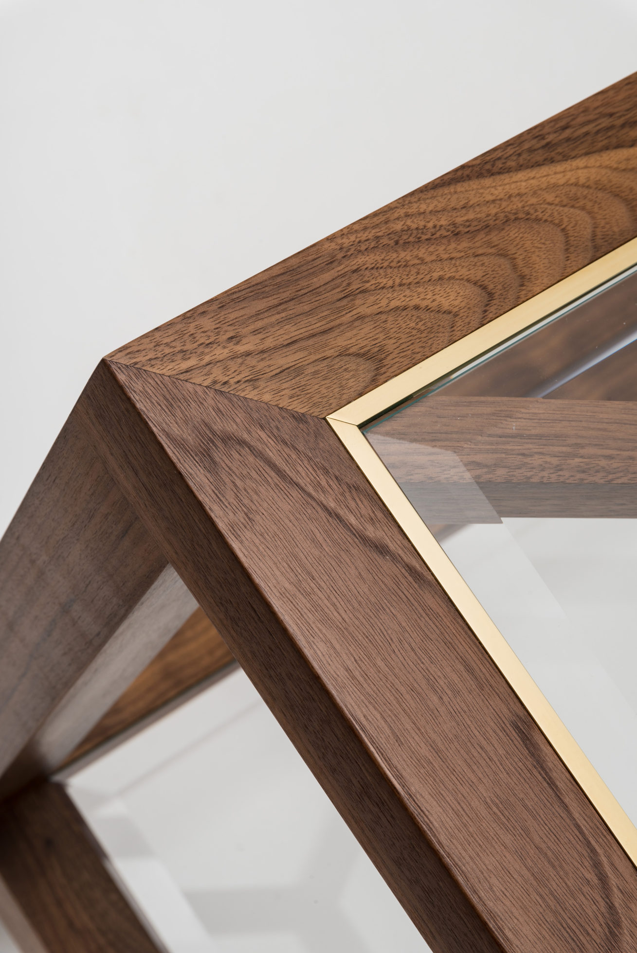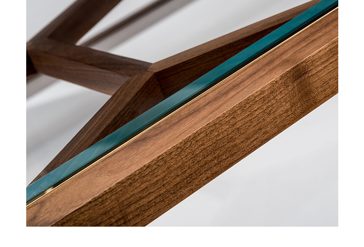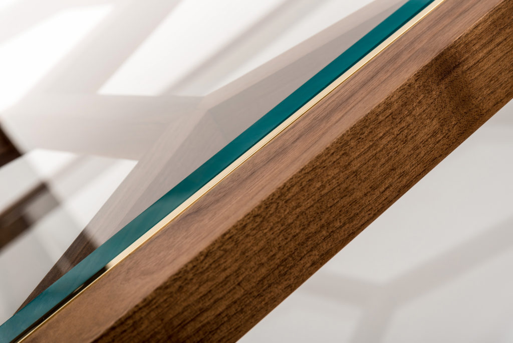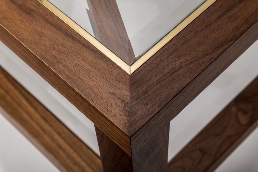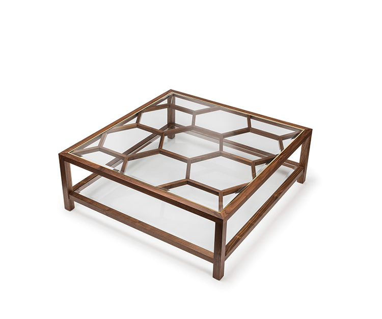 Expressing pattern beautifully, our Archebee Side Table is hand constructed of solid American black walnut and beveled glass with metal detailing. Its inherent strength and delicate form arises from where the beautiful rudiments of geometric form meet natural materials.