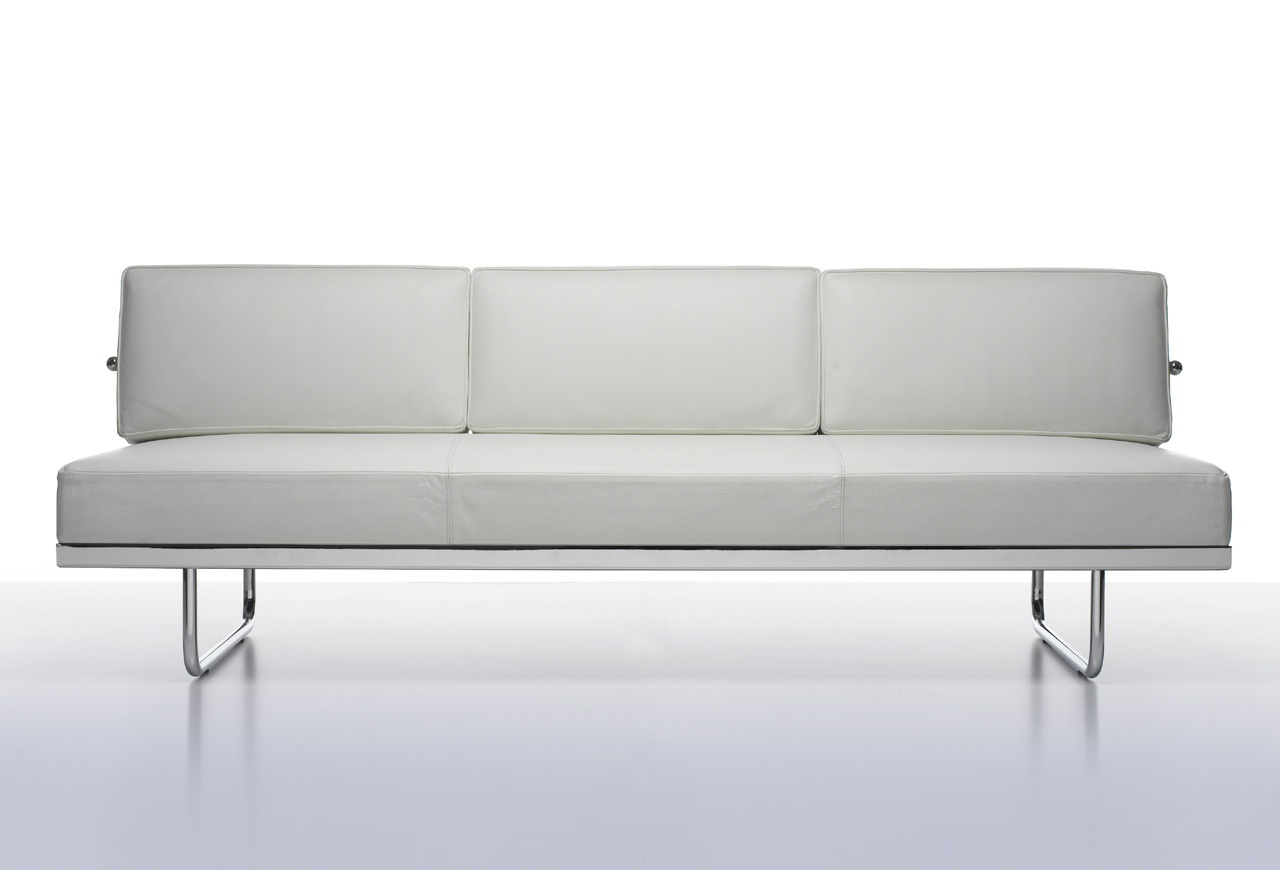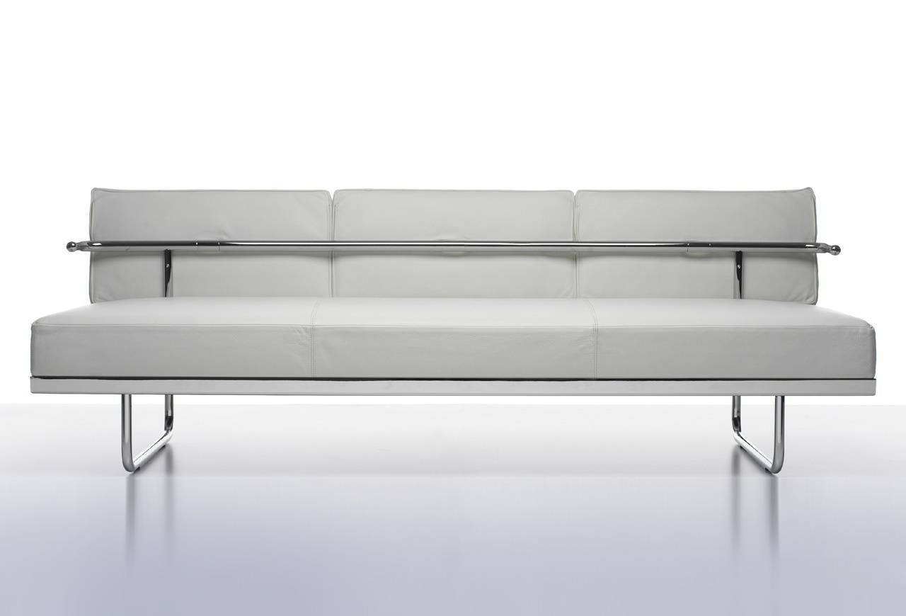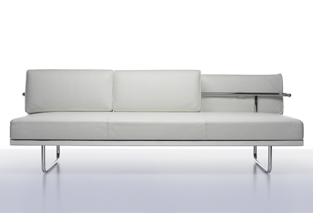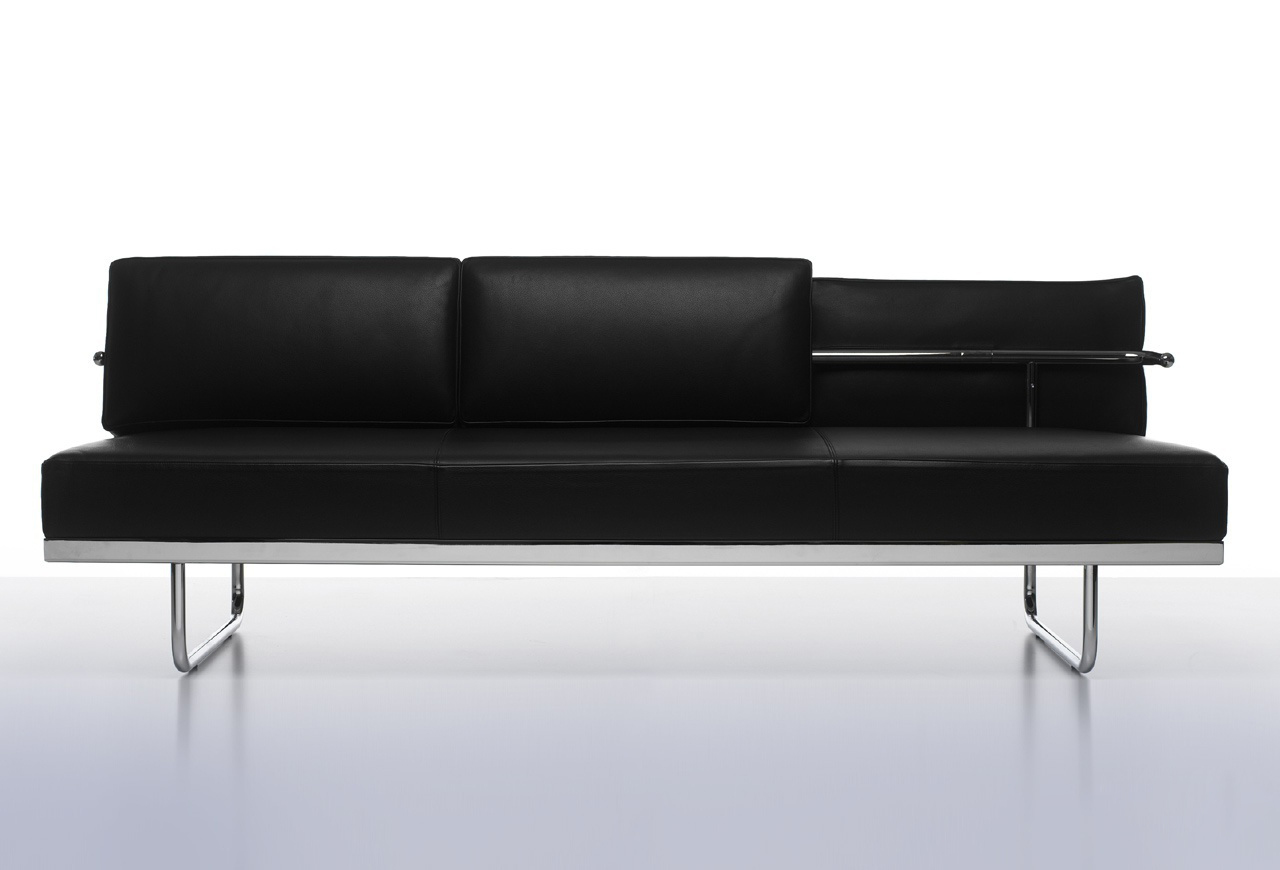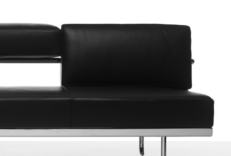 靠垫与后框架通过铰链连接,可放低,从而增加沙发座宽度,变成一张单人床。皮革或布艺面料的软包,可通过拉链全部拆下替换。原版是安置在巴黎Nungesser-et-Coli大街24号的原Le Corbusier和他妻子的公寓。