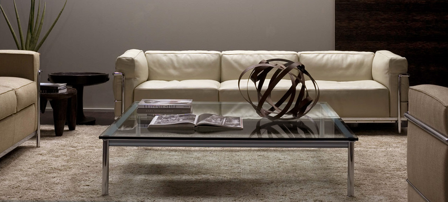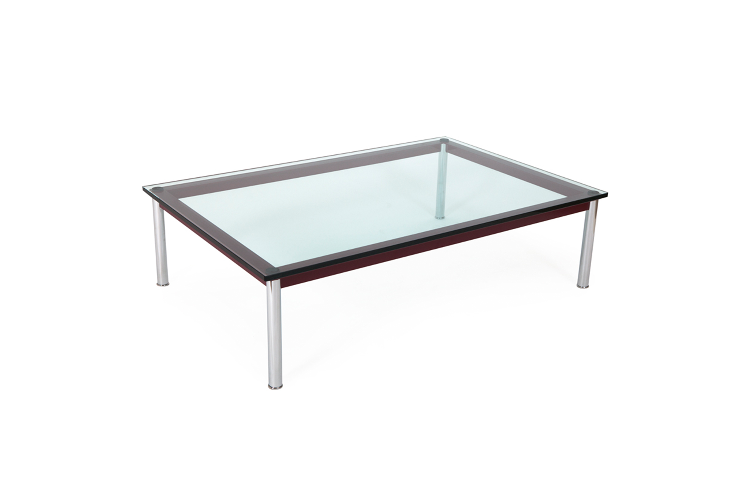 1984年改版的Charlotte Perriand LC10桌子。CR3三价镀铬钢结构涂哑光漆,有多种色彩选择:灰、淡蓝、绿、棕,泥土和象牙或黑色。玻璃台面有透明和纹理两种,15mm厚。也有户外版本。长宽高120x80x70cm, 看起来像是1929年巴黎秋季沙龙中参展的桌子,“居室的装置”的一部分。这款桌子最大地简化了框架,镀铬管状桌腿和喷漆的边饰都很极简,金属处理的表现力实现了桌子的完美效果。