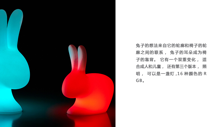 “兔椅(Rabbit Chair)”是Stefano Giovannoni魔术帽的最后一个创作,它成为具有强大的交流媒体力量的产品系列。 兔子的想法来自它的轮廓和椅子的轮廓之间的联系,兔子的耳朵成为椅子的挫折。 它有一个双重变化,适合成人和儿童,还有第三个版本,照明,可以是一盏灯。兔子是一种温柔的动物,可爱而温柔。 在西方和东方文化中,它象征着爱和生育,它是一个甜蜜和吉祥的对象,带来了好运和美好的愿望。