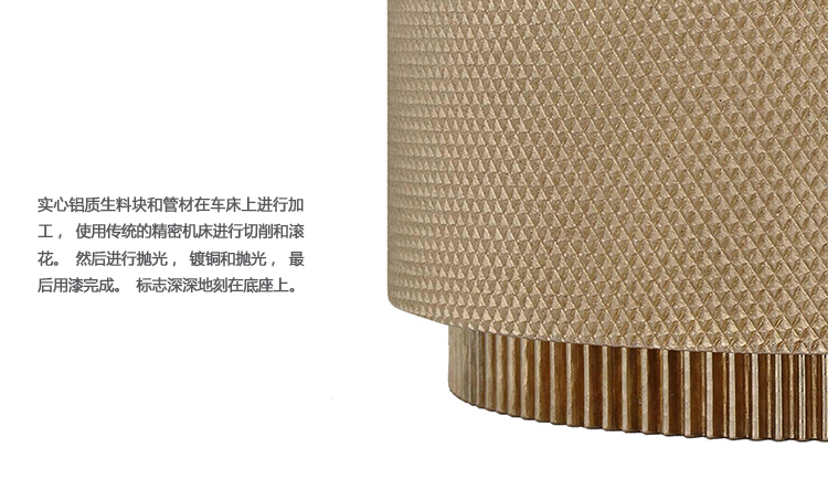 实心铝质生料块和管材在车床上进行加工,使用传统的精密机床进行切削和滚花。然后进行抛光,镀铜和抛光,最后用漆完成。标志深深地刻在底座上。