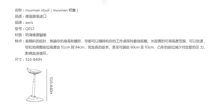 Muvman Stool(Muvman吧凳)是设计师Henner Jahns别具创意的作品,它可坐,站交替,时刻保持活动。 这便是“muvman” 的秘密。 感谢配备了专利flexzone®技术的“muvman”给予你舒适,健康和自由活动。这便是现代应有的坐姿。“muvman”向前倾斜的设计,这意味着无论你的身高和体形,你都可以随时和你的工作桌保持最佳距离。一个聪明的座椅,给你适当的支持而不会造成压力点。 而muvman也有很多实用的细节,如座椅的把手,方便移动。 先不提设计已获得国家和不同的国际奖项,单是造形已很美观。您可以快速,轻松地调整座位高度由51cm到84cm。 而加长的版本,甚至可调由60cm至93cm!这使你能和工作桌保持最佳距离 。无论你的身高和体质。“muvman”也能减少你拱起腰部的座姿。凸形的座位减少对血管的压力,影响血液遁环。这样可以使你的臀部和腿部肌肉,自由,灵活活动。 这提高了血液从腿回转到心脏的能力。防滑,无划伤橡胶脚垫为您提供了坚定的支持。为了便于携带 “muvman”到你想要去的地方。弹簧支柱向前倾斜设计的muvman,长程的高度调较使能配合标准高度的桌子。多变的站立/坐姿座椅有一个稳定的底座,具有防滑,无划伤橡胶辋。 软垫座椅感觉良好,天鹅绒般的超细纤维织物表面带来舒适的触感。 衡温和透气。独立设计机构曾为muvman于2009和2011年提名德国设计奖-德国官方最高的设计奖。于2009年,muvman赢得了著名的芝加哥阿西娜优秀设计奖 (GOOD DESIGN Award of the Chicago Athenaeum)。 此外,的“muvman”已经荣获国际IF通用设计消费者最喜爱奖( iF Universal Design Consumer Favorite Award),并在柏林和纽约的设计展,吸引了大量的关注。
