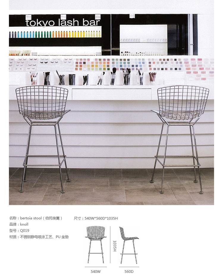 bertoia stool(伯托埃凳)是美国设计师伯托埃设计的,1950年,Harry Bertoia尝试用钢枝制造出结实、轻便而又经济的椅子。1952年,他通过弯曲的金属棒来设计出这张极具创意的伯托埃吧椅(Harry Bertoia Barstool),这张椅子适用与餐厅、酒吧、高档会所等地,利用了金的外形给椅子赋予了现代感,因为生产简单、材料简便,时候大规模的生产,非常适用于商业空间,这或许就是设计的力量可以改变 经济结构吧。