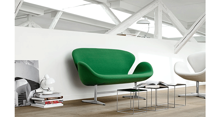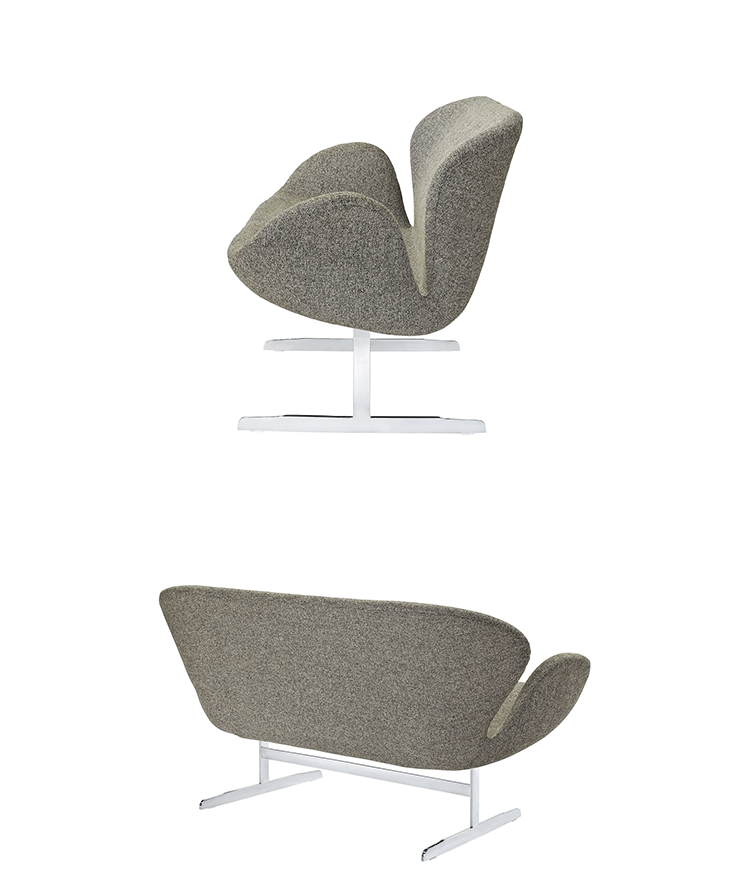 1958 年,Arne Jacobsen为哥本哈根皇家大酒店21楼房间的套房、 休息室和全景房设计的这套Swan Sofa(天鹅沙发)。天鹅沙发是两个坐席版本的天鹅椅,这个优雅的沙发设置在铝振动筛脚架上。优雅的和有机的形状非常适合休息室和等候区,以及家庭。雅各布森作为一个著名建筑师,同时也是一位非常成功的工业设计师,他为丹麦著名的FH家具公司〔FritzHansen〕设计了一系列座具家具,都成为市场欢迎的畅销产品。他的家具设计作品都是享誉国际的经典设计,天鹅椅就是其中之一;他将自由流畅的雕刻式塑形,以及北欧设计的传统特质相结合,使其作品具有质感非凡与结构完整的特点。天鹅椅制作采用玻璃钢框架内胆、内部填充高密度沙发棉、表面扪高级进口羊绒布料或PU或真皮、铝合金脚架(可振动)。