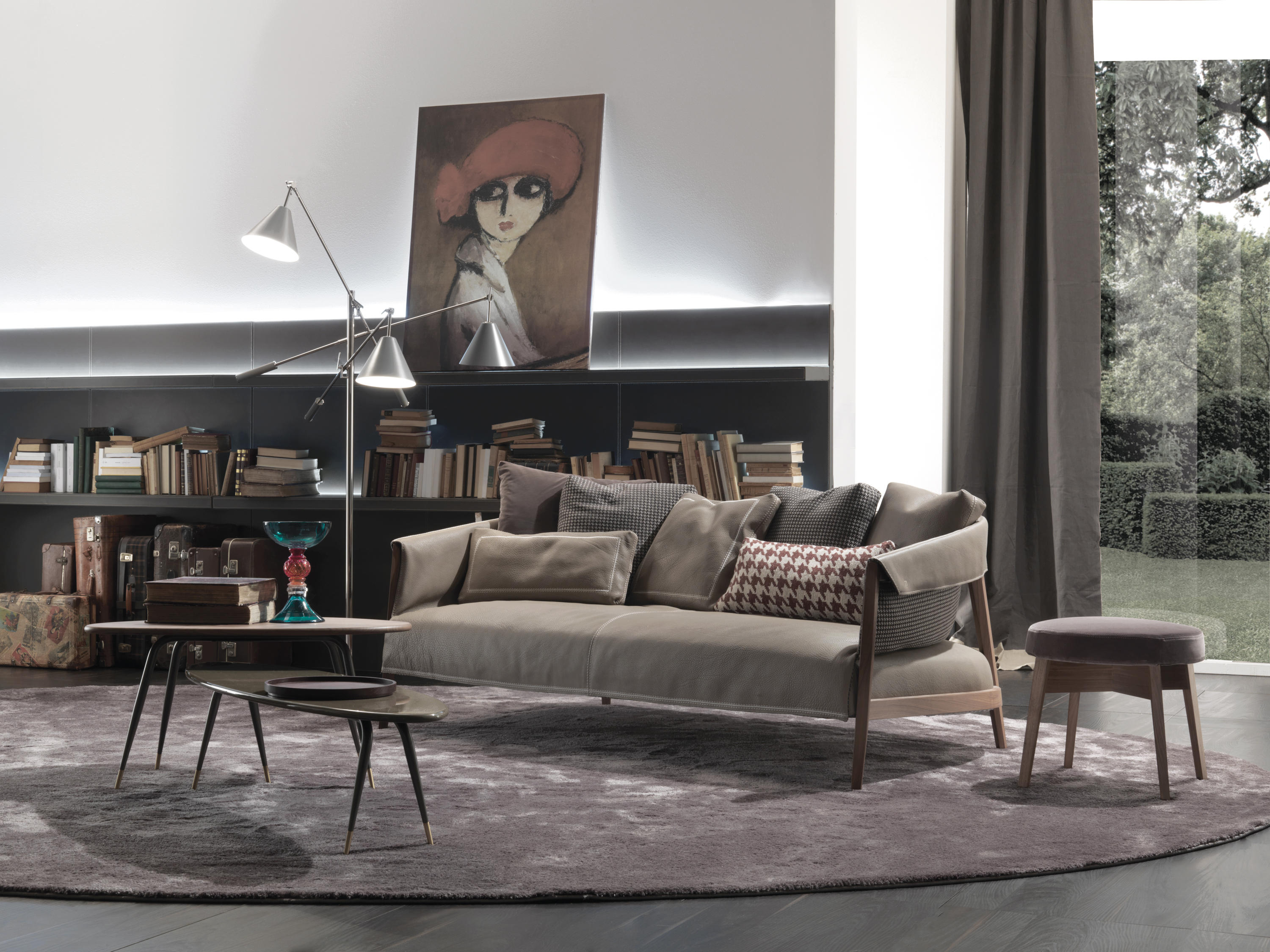 特别注意的腿倾斜,使重量轻的组成由于剪切恢复特性即使在休息:一个补充了这沙发,茶几的pouff。