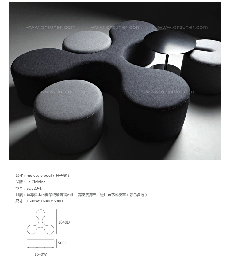 Molecule Pouf(分子墩)为意大利知名设计师 Stefano Bigi 所设计的家具作品系列,此系列包括两款形状产品三叶形结构以及圆柱体结构,可搭配其他装饰的元素和小会议圆桌,您可根据喜好进行组合搭配。制作采用防霉实木内框架或玻璃钢内胆、不易变形、高密度海绵、进口布艺或皮革(颜色多选),需要提醒的是,其布艺或皮革外套是不可拆卸的。