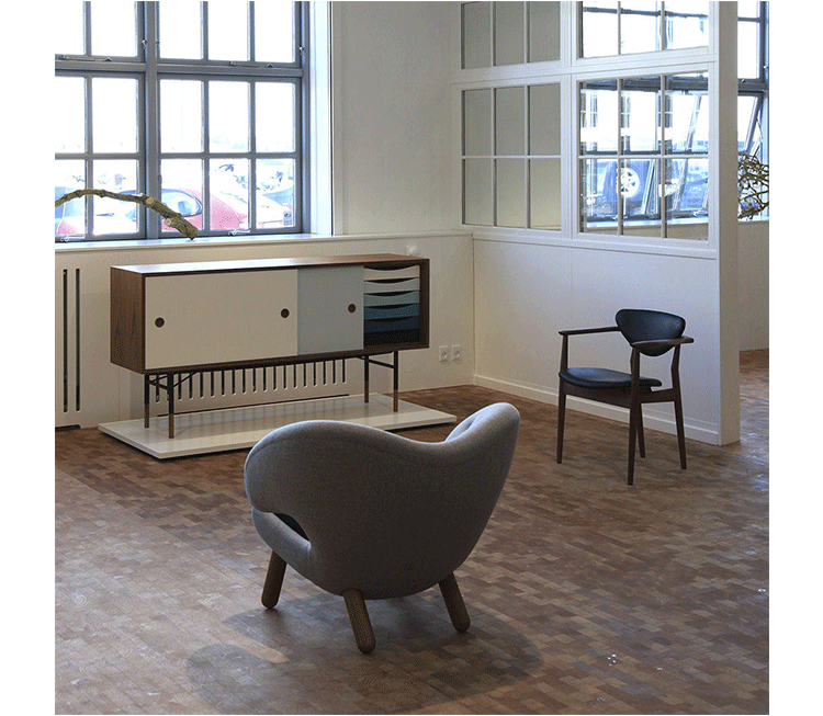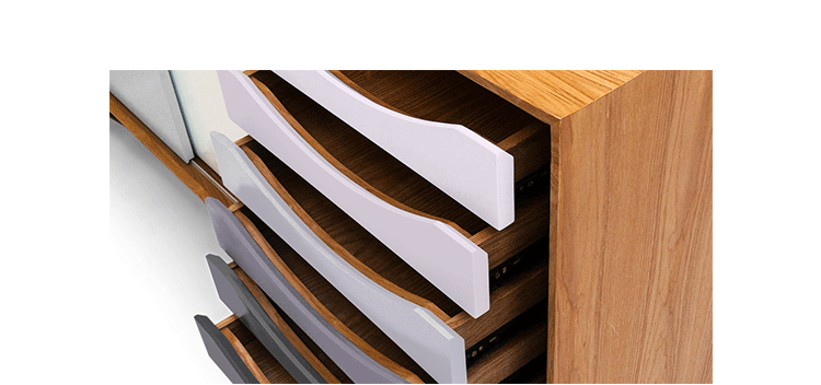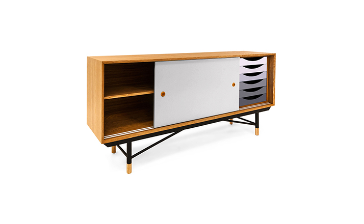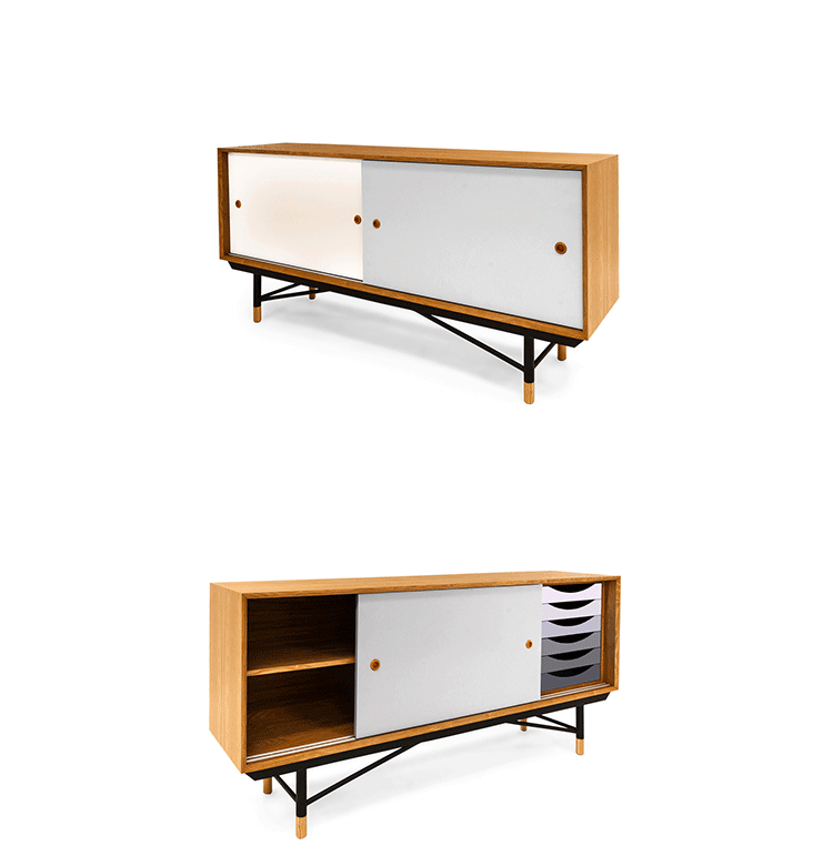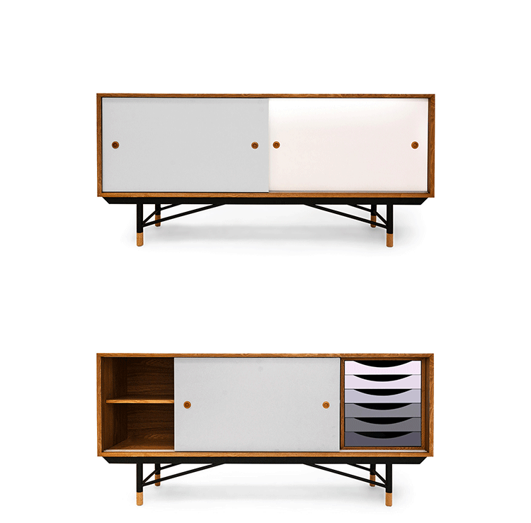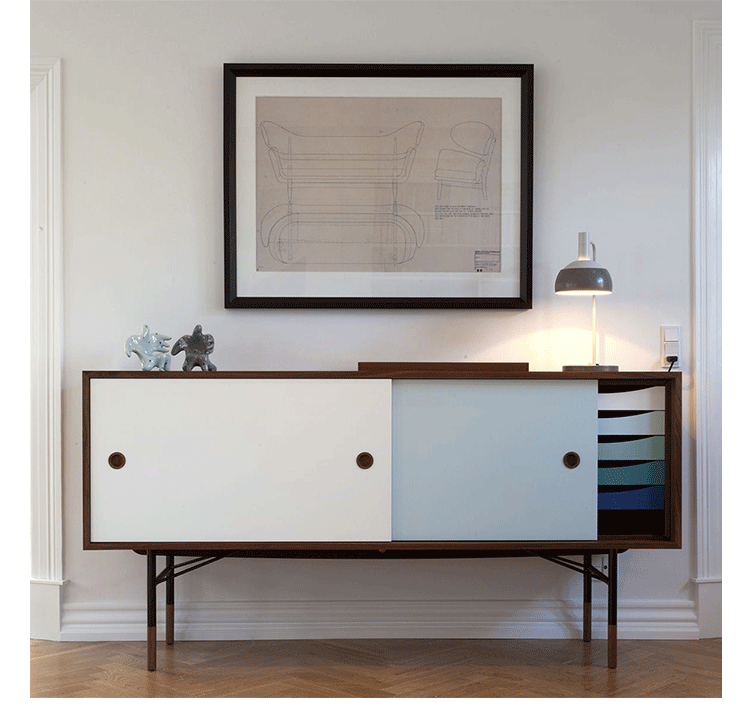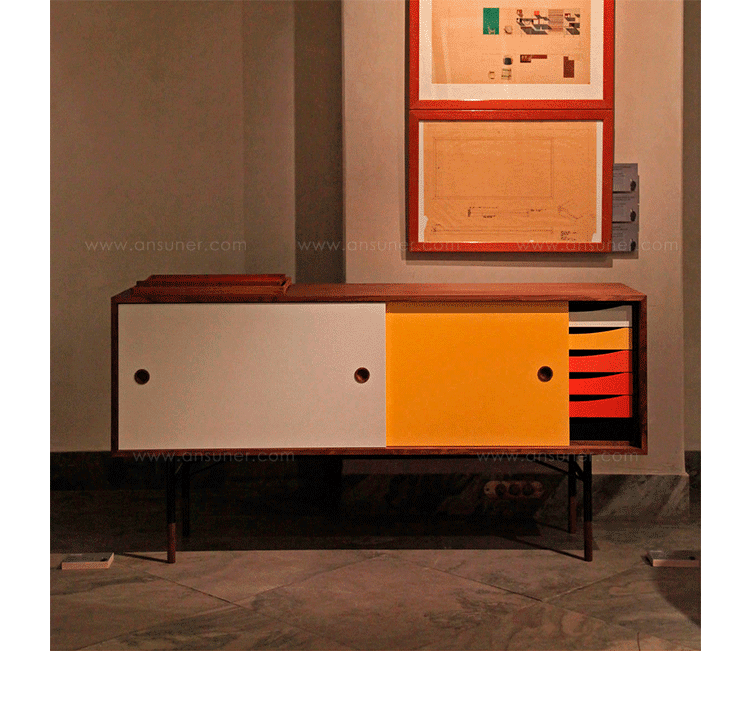 color theory sideboard(色彩理论餐边柜)是设计师Juhl Finn设计的,Kardiel公司制作的经典实木家具,1940年,他设计的第一张座椅、也是最经典的作品——《鹈鹕椅》(Pelican Chair),目前为纽约现代艺术博物馆 MOMA 所珍藏。彩色的滑动门与托盘餐具柜是1955年由Juhl Finn为BOVIRKE设计的。)是Kardiel公司制作的经典实木家具。复古但永不过时的木炭是和橙色,结合美国核桃开创了20中世纪六十年代中现代主义的时代。在现代主义的存储家具上, Finn Juhl和 Arne Vodder 最先尝试胶木和天然木的组合运用。这是大胆的创新,他们结合传统的新鲜的新兴技术与现代主义的概念。他们通过这些色彩绚烂的产品所实现的是令人印象深刻的比例的平衡。制作采用精选MDF板基材胡桃木皮或水曲柳贴面、五金脚架、环保油漆喷涂、做工精湛。颜色元素的使用反映了他迷恋歌德的著名彩色圈,颜色处于和谐的凝聚力。