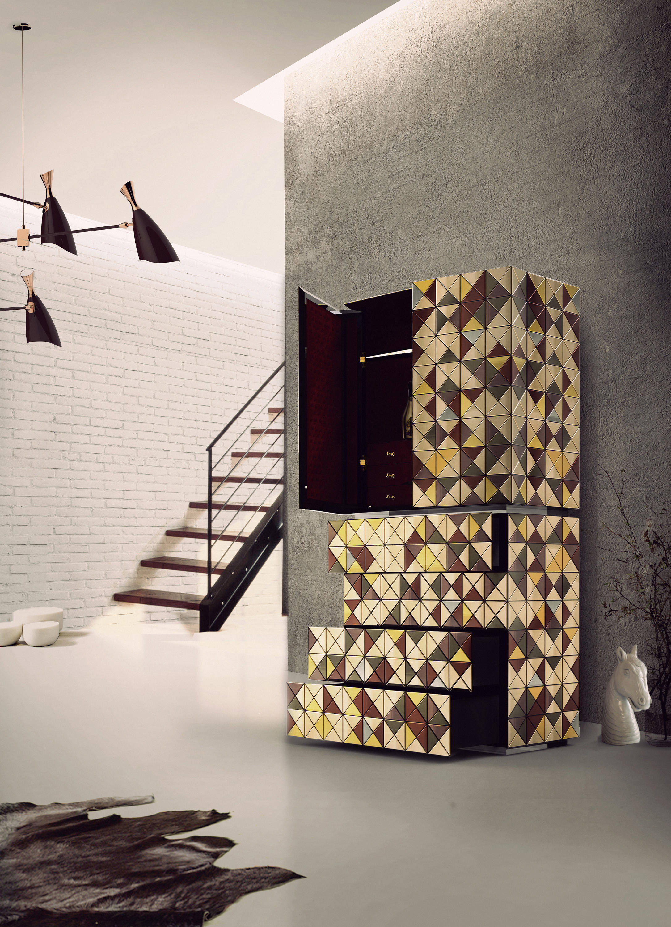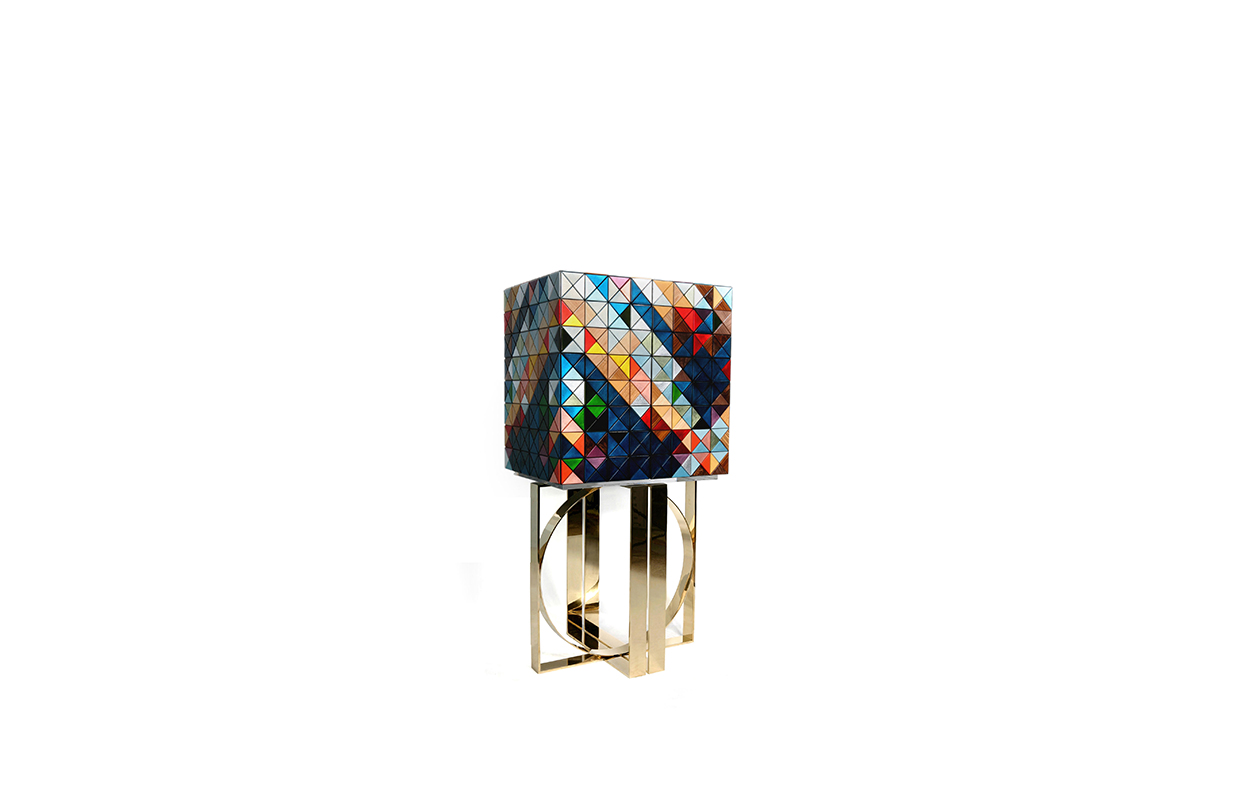 1088木森林的多样性和完成三角形:银叶,金箔,彩色涂料,十个不同类型的木材叶(乌木单板、非洲胡桃木单板、zebrano单板,杨树单板,黑黄檀。 室内:两扇门在里面完成钻石绗缝蓝色丝绸织物开放九个抽屉用金旋钮和内阁空间所有年龄在镜子里完成。 基础:抛光黄铜