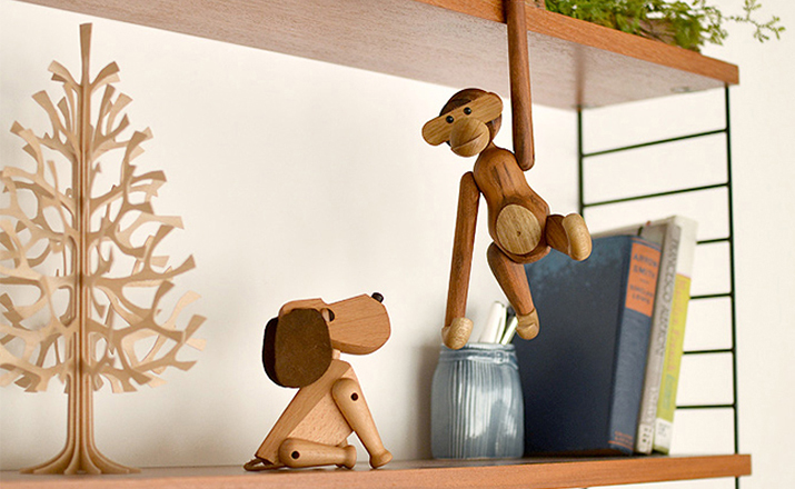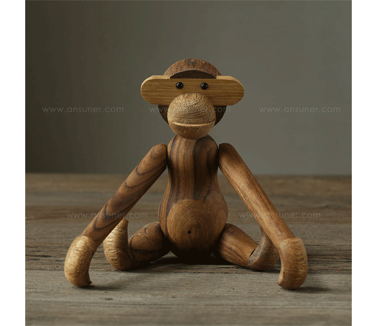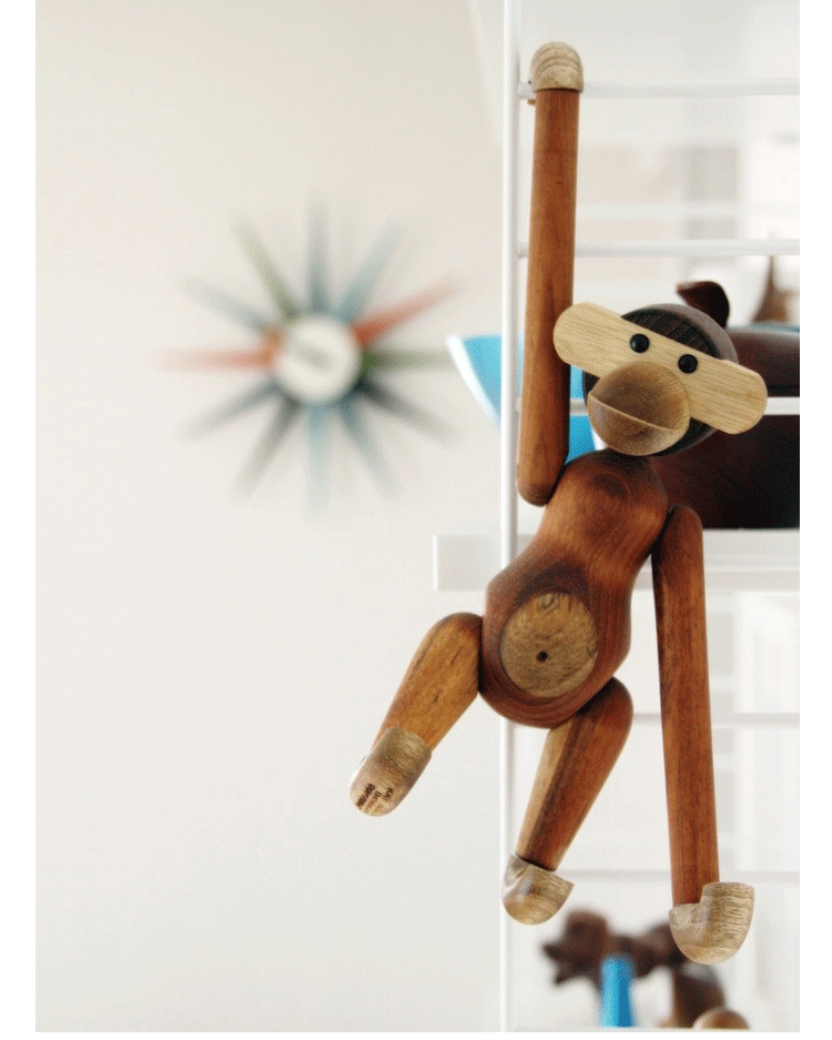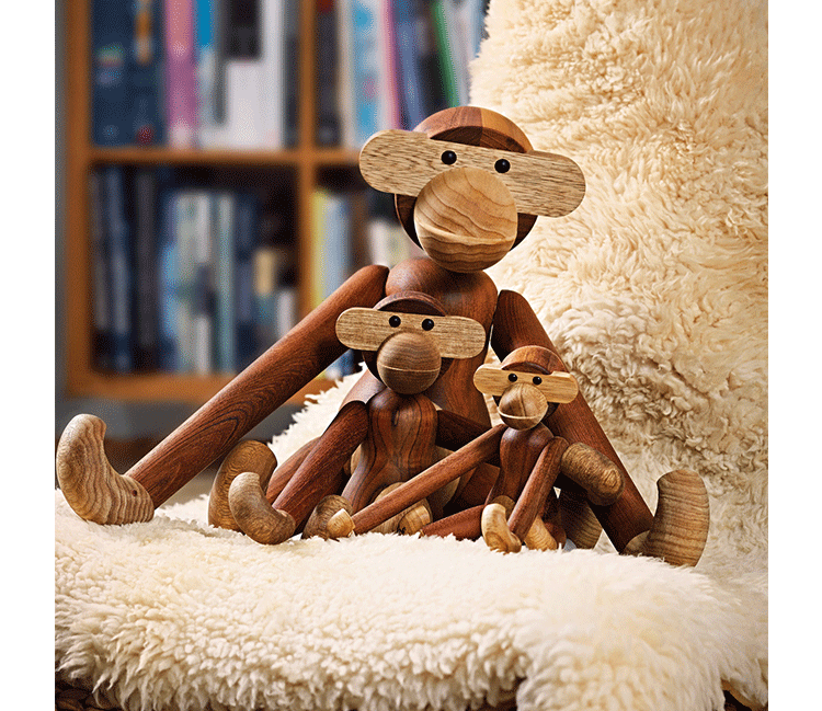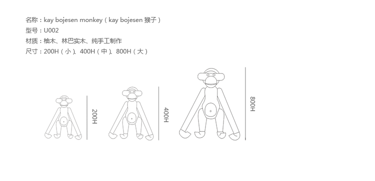 Kay Bojesen Monkey(Kay Bojesen 猴子)出自丹麦设计大师 Kay Bojesen 的设计作品,设计于1951年,精致的木制动物系列,是 Kay Bojesen 为人熟知的珍藏作品系列,采用不同的橡木、枫木、柚木等原木素材,保留木材的独特纹理,刻画出各种不同让人莞尔一笑的动物姿态,跳脱生活中的烦琐与紧张,简单的玩偶,轻松的神情,带您回归孩时的天真与简单快乐。精致而限量珍藏的作品系列,适合您作为桌面摆设,或是作为送礼小物,分享您生活中的快乐写意。可爱的小猴,可摊坐、吊挂树上、摇晃走路等,自在摆出您喜爱的完美姿态。英国著名杂志 Wallpaper,曾一次摆出 50 只不同姿势的猴子,带动您的全面想象和创造力。