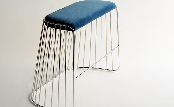 "The Bride's Veil Stool family’s unique language is meant as a graceful alternative to the archetypal bar stool.The double stool is the perfect solution for you and your date to enjoy sitting together uninhibited by separate stools.The strikingly elegant metal base is available in smoked brass,polished chrome, burnt copper,or powder coat,while the top is offered in COM upholstery.At every angle these stools offer a visual treat."