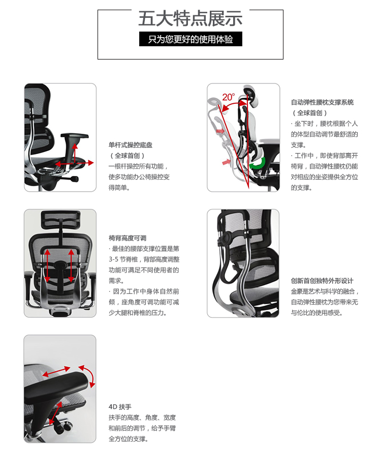 全球首创的单杆式操控底盘,一根杆操控所有功能,使办公椅的操控更加人性化;自动弹性腰枕支撑系统,无论是在坐下时、工作中、或者后仰时,都能让使用者的腰和背获得最舒适的支撑;金豪+系列采用完全性多功能调整设计,从椅背、扶手与座垫可进行全方位的调整;