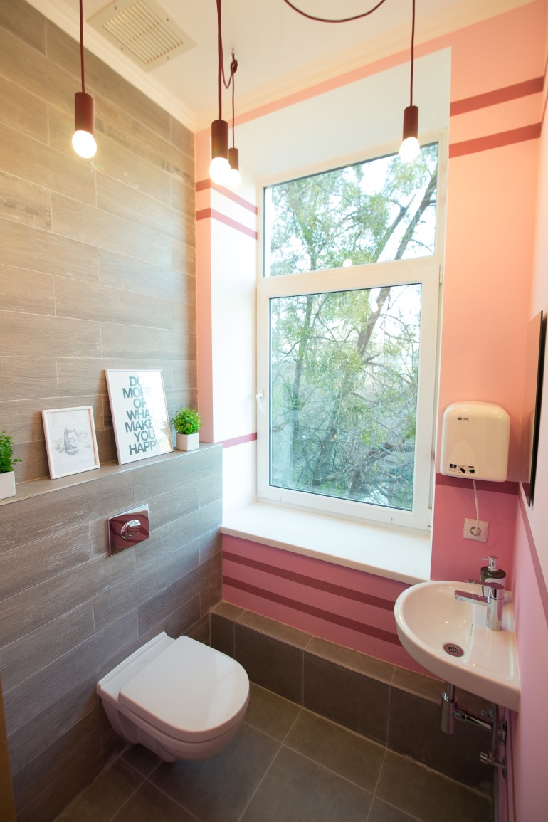 三个洗手间分别设计成三种主题色彩,并以各自的色彩灯具来搭配。小小的空间却处处彰显着精致与创意。