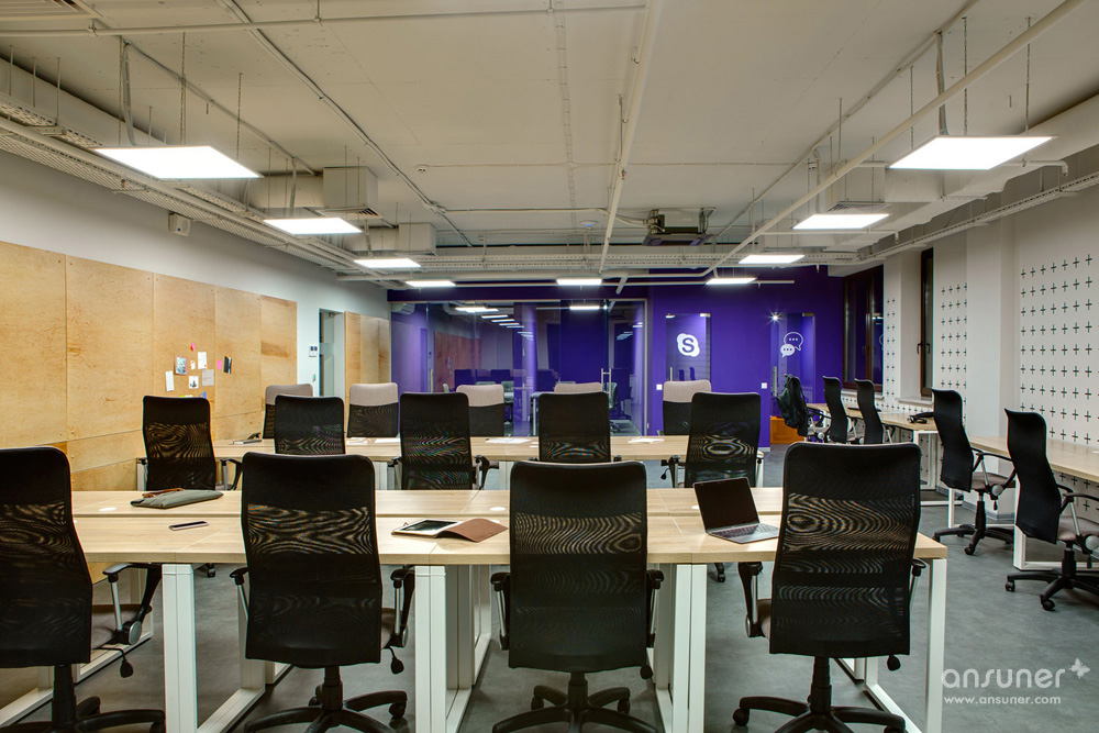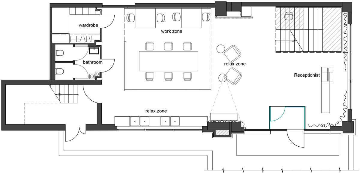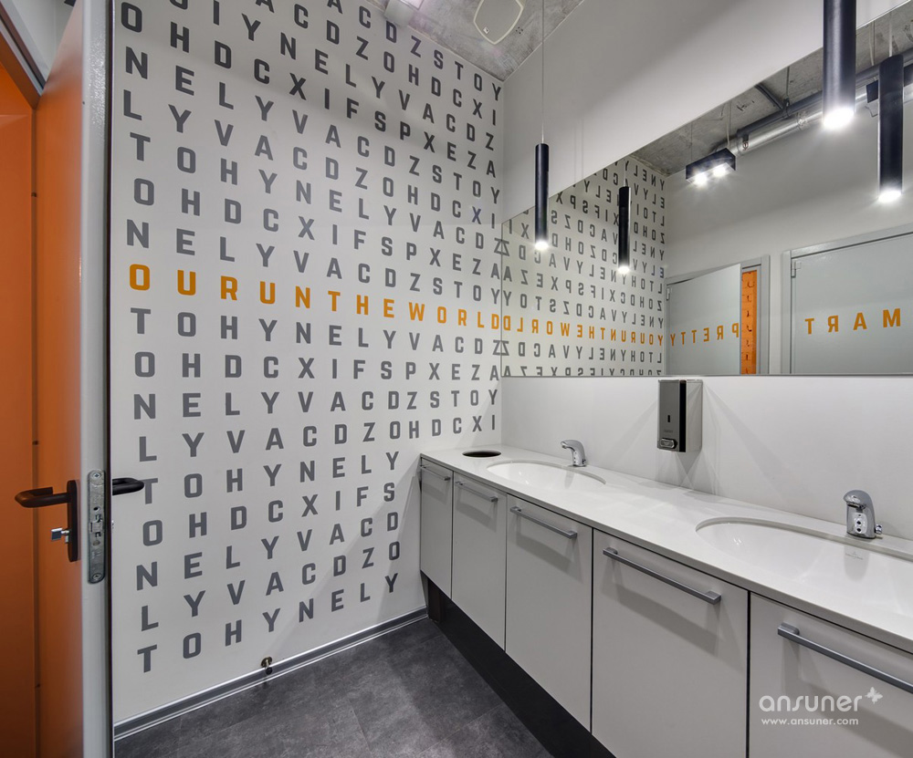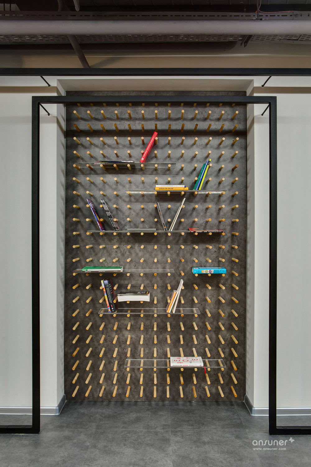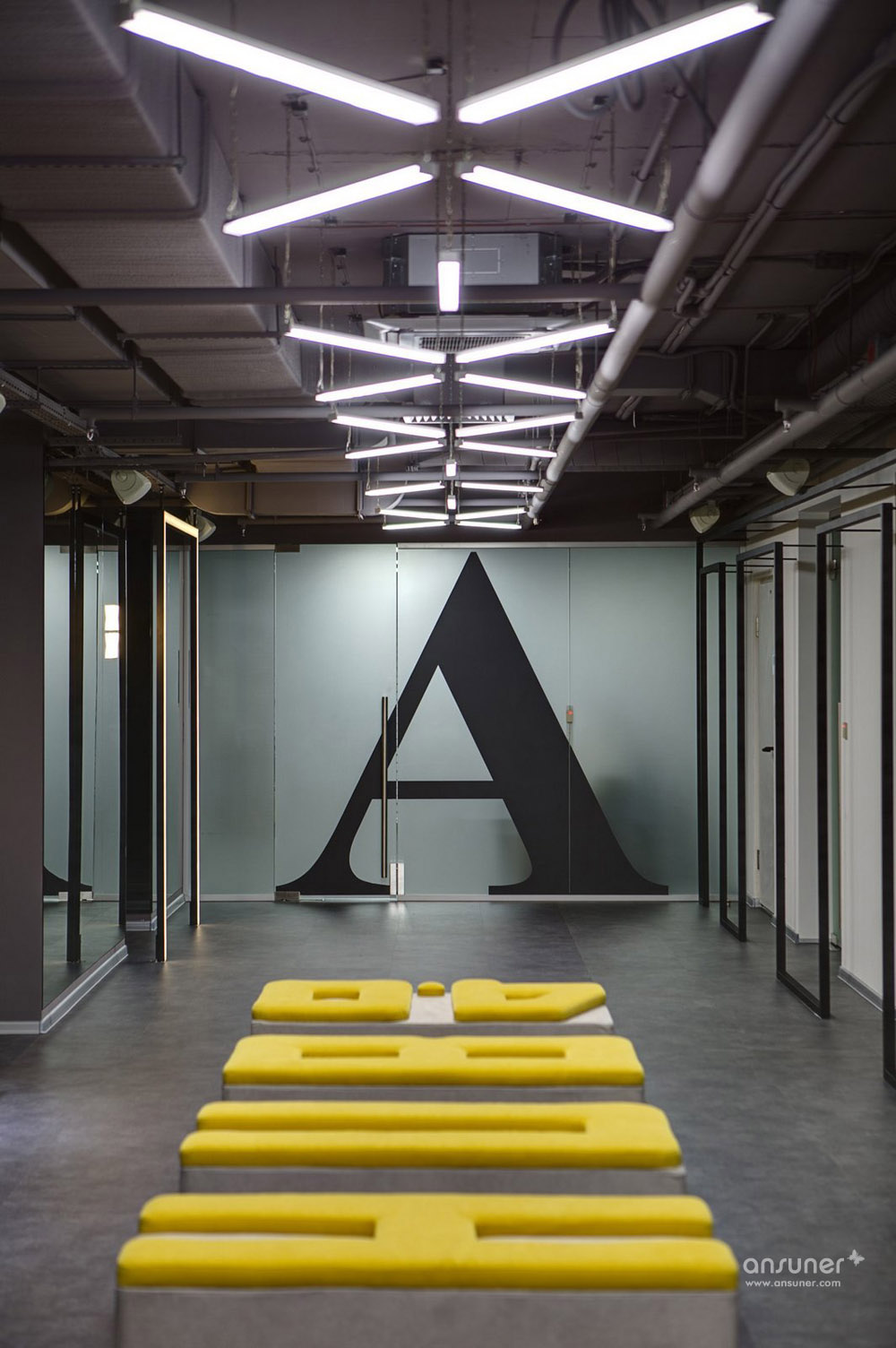 三层主要用作联合办公空间,配有会议室、skype视频聊天室、以及几间专题会议室。这里还配以开放而流动的华体会平台、以及采用接待区的格调布局的商务洽谈区。在这个洋溢着极简工业美学的工作空间里,设计团队运用了大量的创意吸引创业者,如鲜明饱和的色彩点缀、大量的创意图形与文字设计等。