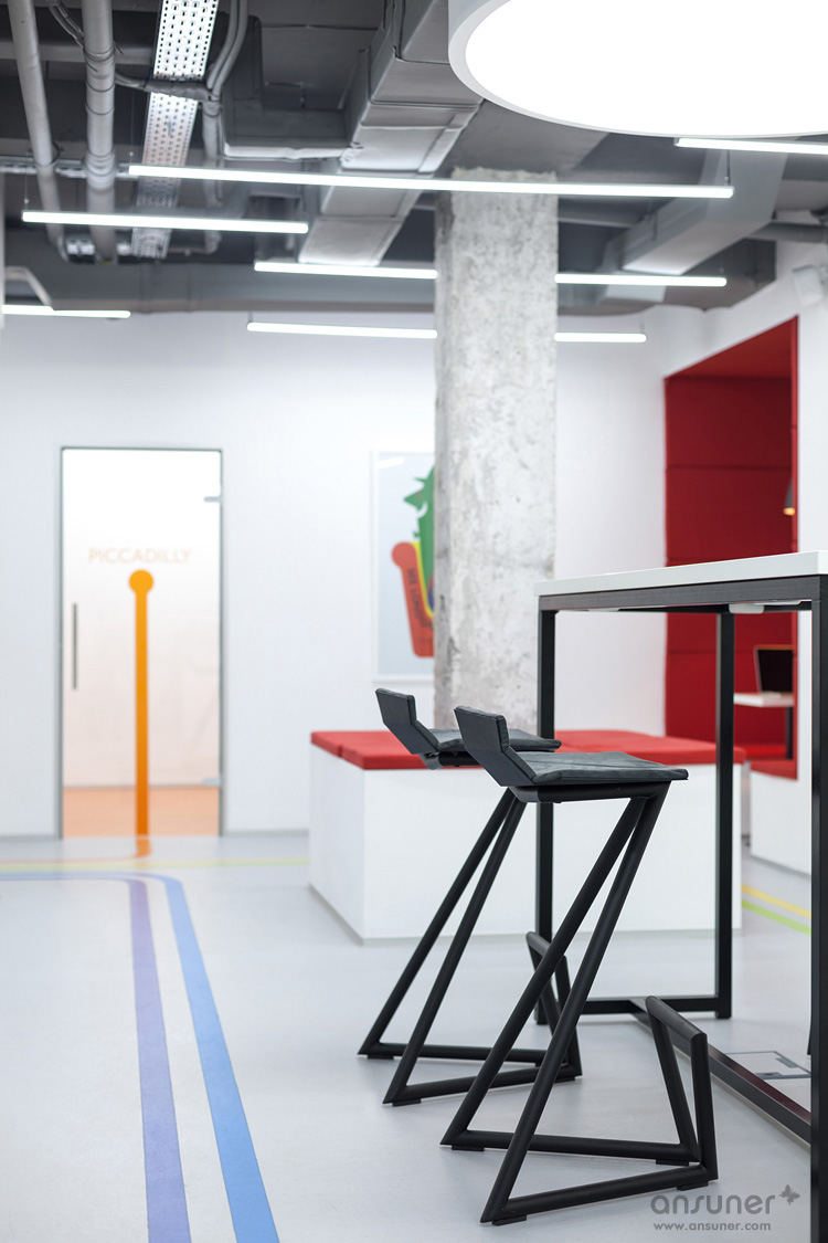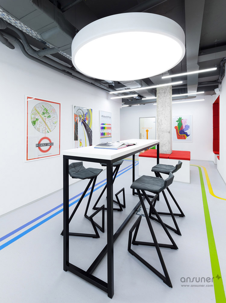 Underhub是乌克兰基辅本地的一家现代语言学校,同时这里还兼做联合办公空间,设有共享工作区、会议室和休息区。本案的设计灵感来自伦敦的地铁环境设计,将靓丽的导向色彩引入到室内设计中。如此充满创意的设计构想来自于基辅本地的一位才华横溢的建筑设计师 Emil Dervish。