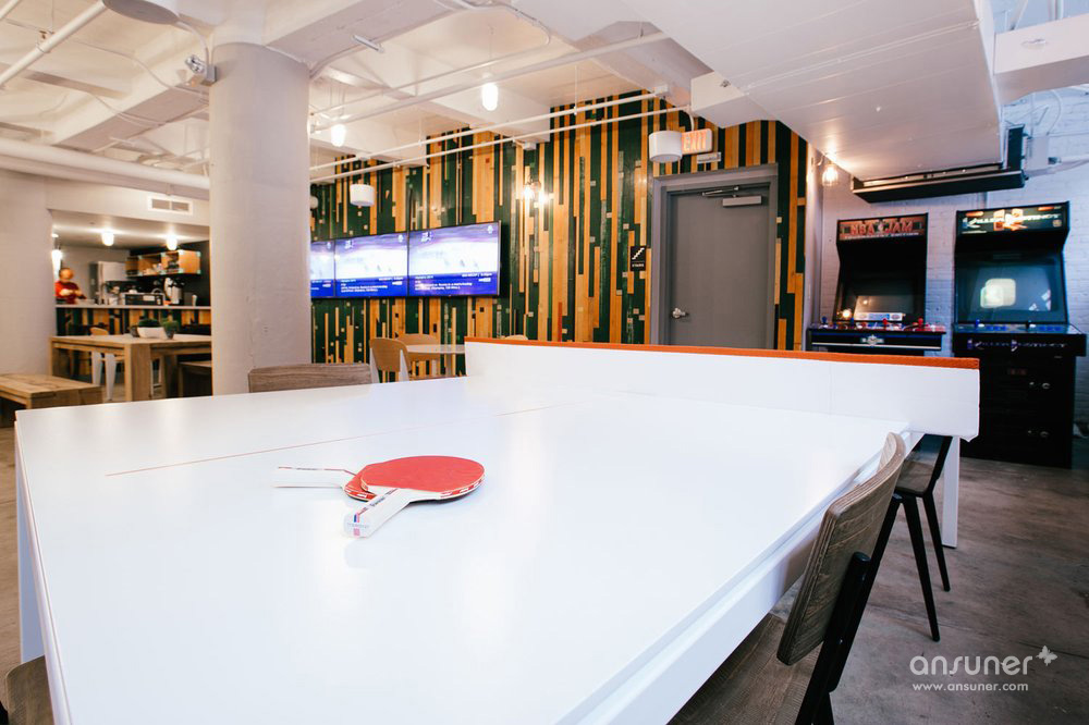 这处办公场地原是一家羊毛厂,自身散发着独特的工业风特质:高耸的梁架天花、坚固的粗壮的柱子以及斑驳的水泥地面。WeWork占据这幢九层砖混建筑的五个楼层。巨大的玻璃外窗,让阳光自由倾泻入缤纷多彩的公共区域。位于后部的开放办公区,人们可以将塞岬海峡的美景一览无余。地下室的休闲区类似一个运动吧,经过一天的紧张工作,人们可以在此尽情放松享受快乐时光。