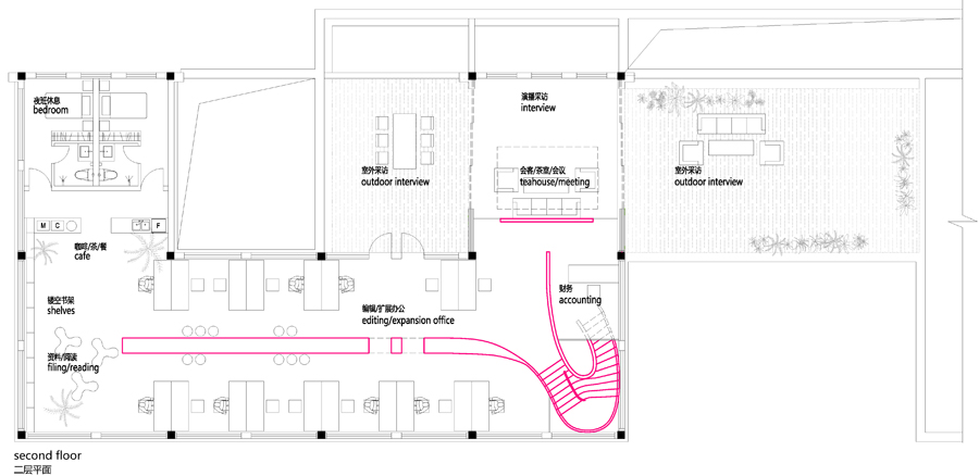 该办公室内装设计项目位于浙江省杭州,虽然基地拥有良好的室外自然景观条件,但原有建筑内部阴暗压抑:已有结构的1层层高3.3m ,梁下高度2.6m, 空间比例相对低矮;2层空间的高度具有优势,但1,2层的联系较弱,原有建筑的双层特点也并没有展现出来。