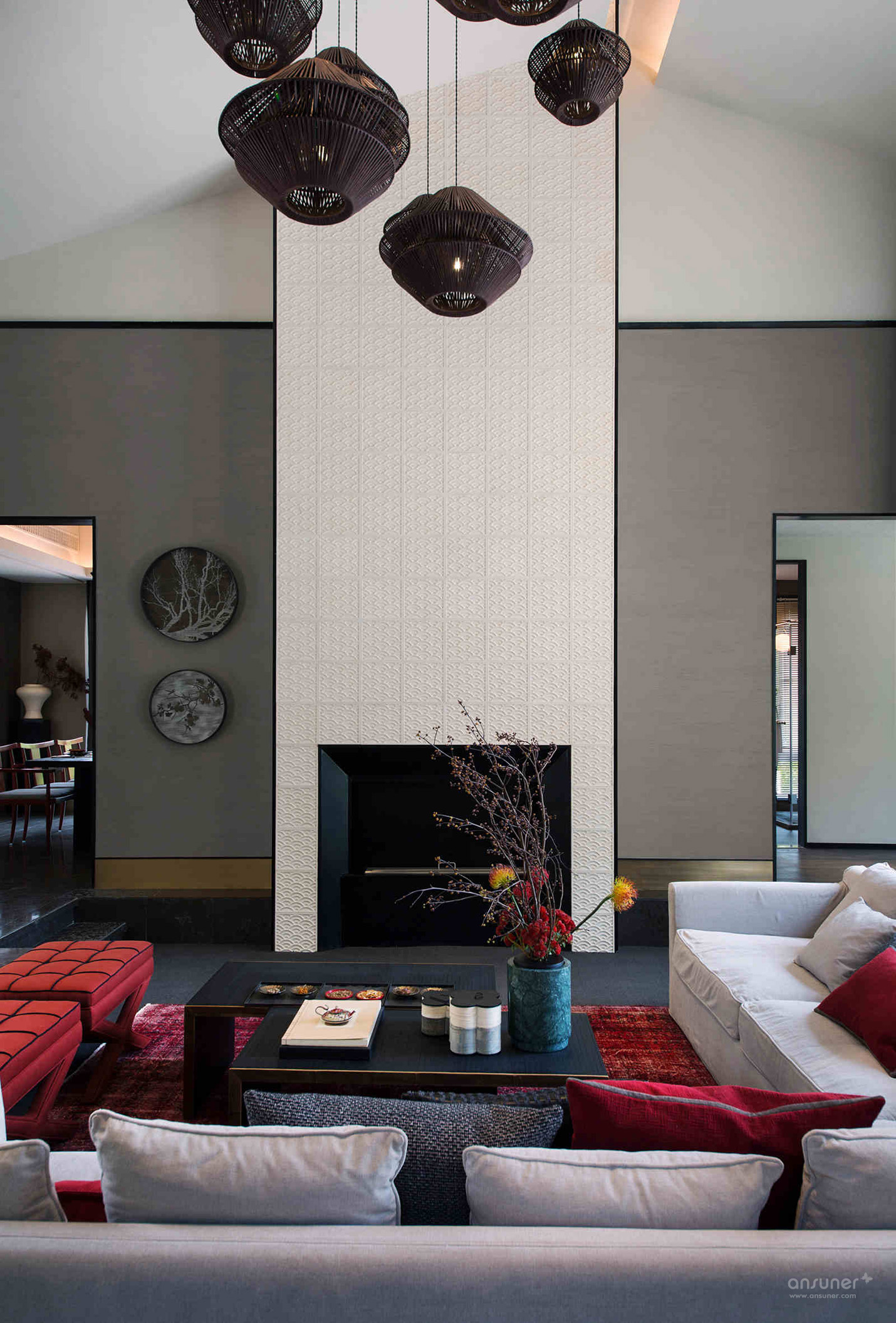 客厅:软装设计上,色彩浓重与用材粗放的矛盾组合,不拘一格,在隐藏的静室之下掺杂了强烈而又煽情的色彩视觉。细节处低调嵌入优雅的中国传统纹样,以打破重组的独特手法,在空间里造成恰当的碰撞,粗粝的花樽中,娇俏的花枝摇曳,明艳中还带有丝丝缕缕的纯真。