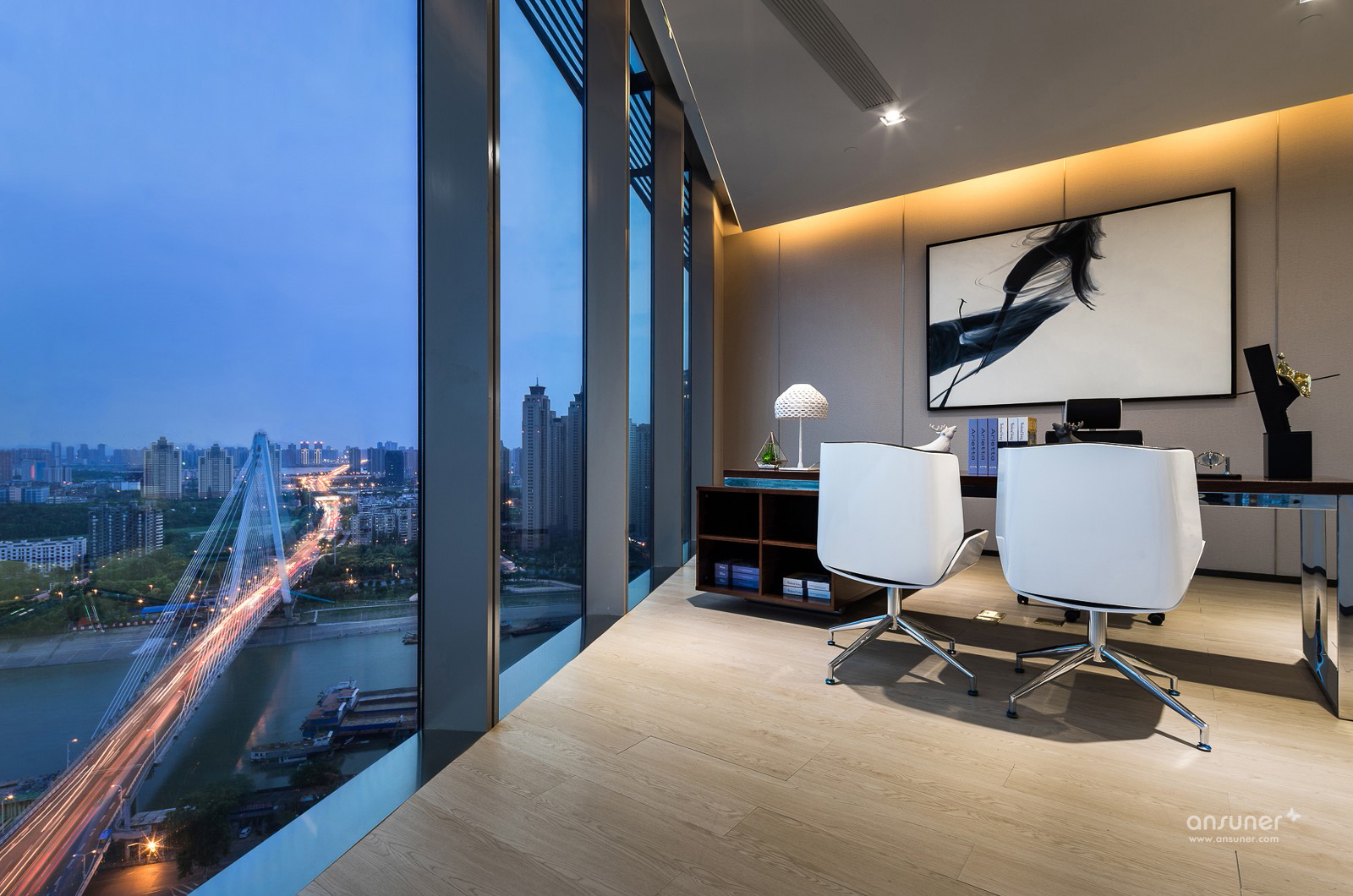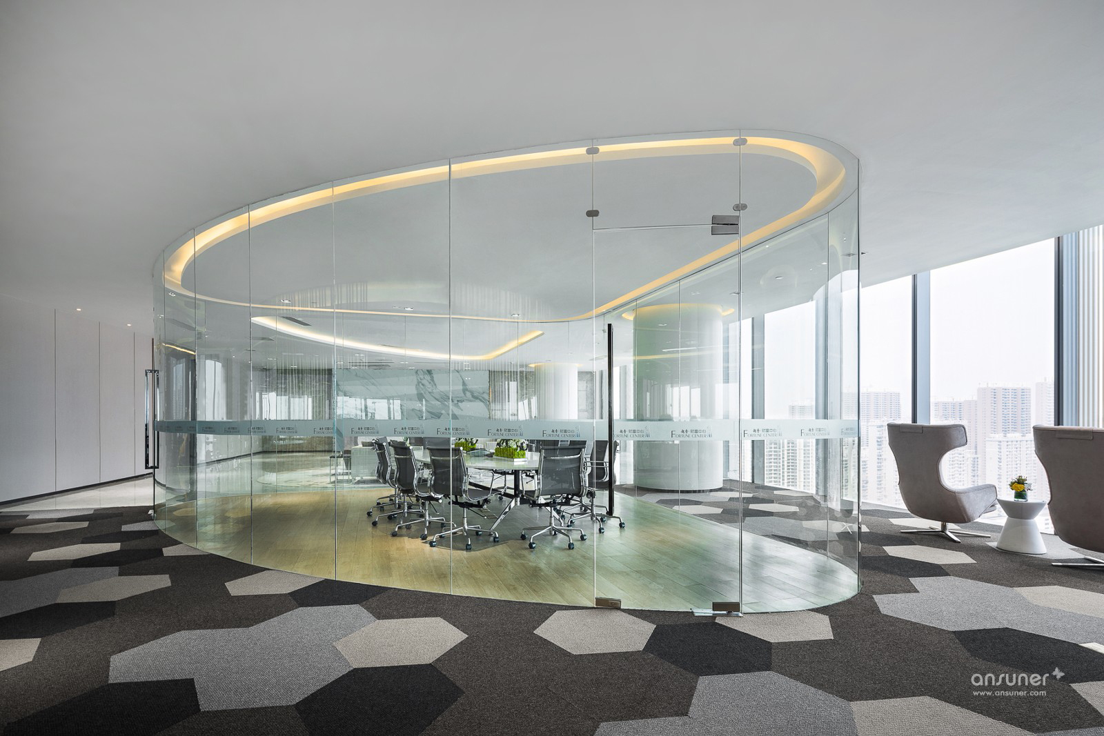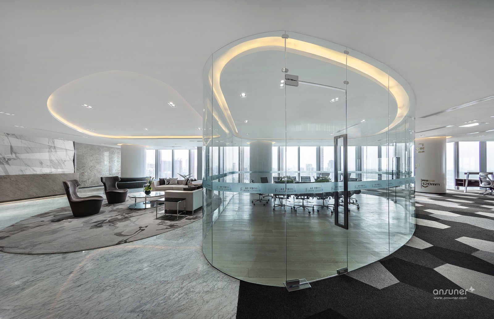 武汉越秀财富中心为华中地区位居第三的高楼,总高330米,地处武汉汉口核心地段,内环线西顶点,承武广,临汉江,居百年大道一中山大道之源。项目位于22楼的办公示范间,为营造一个既开放又相对独立的办公空间,设计以黑、白、灰为主色调,空间以圆弧玻璃划分。