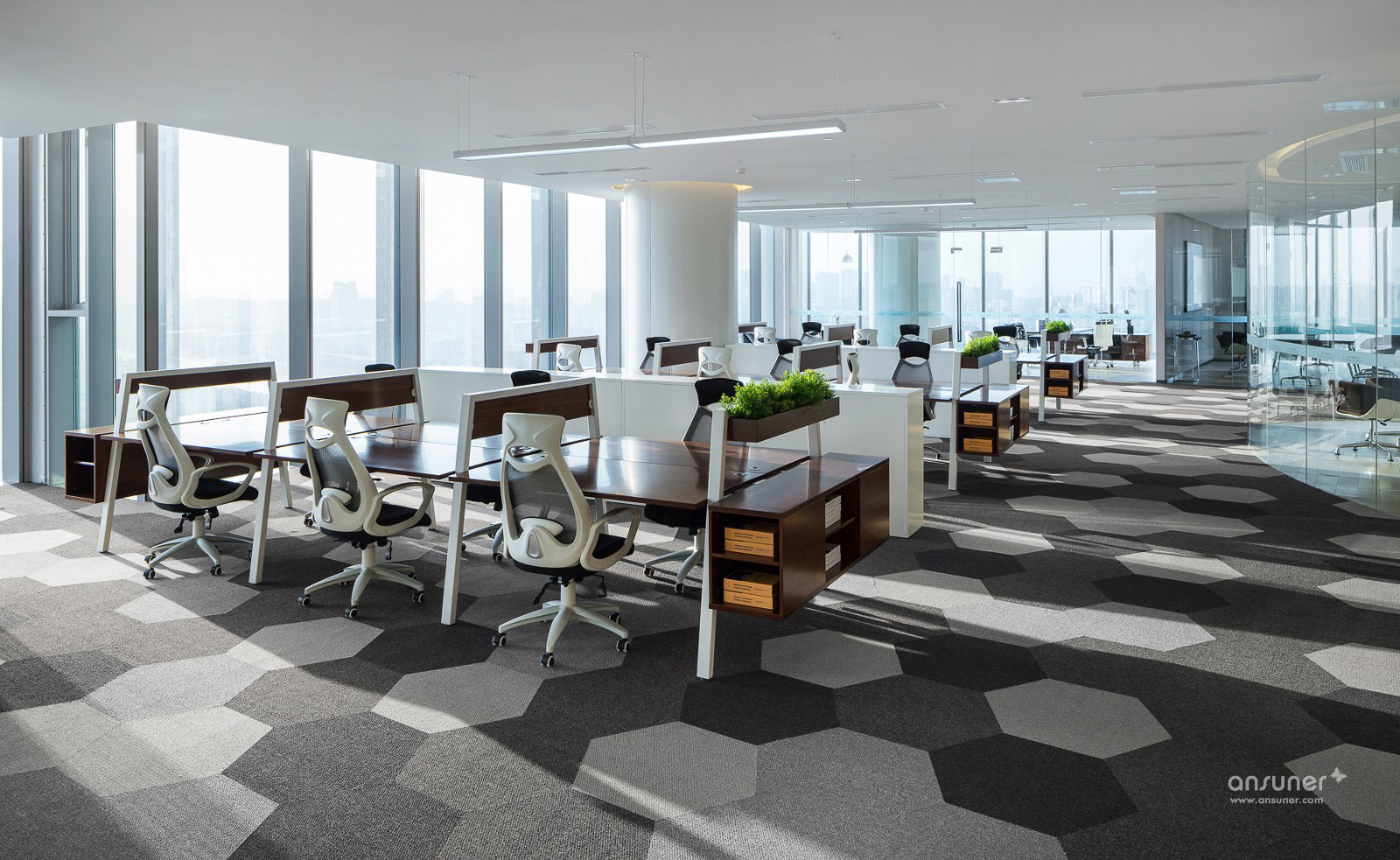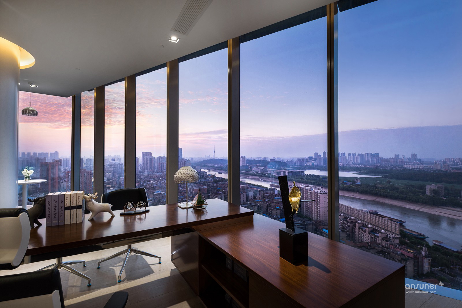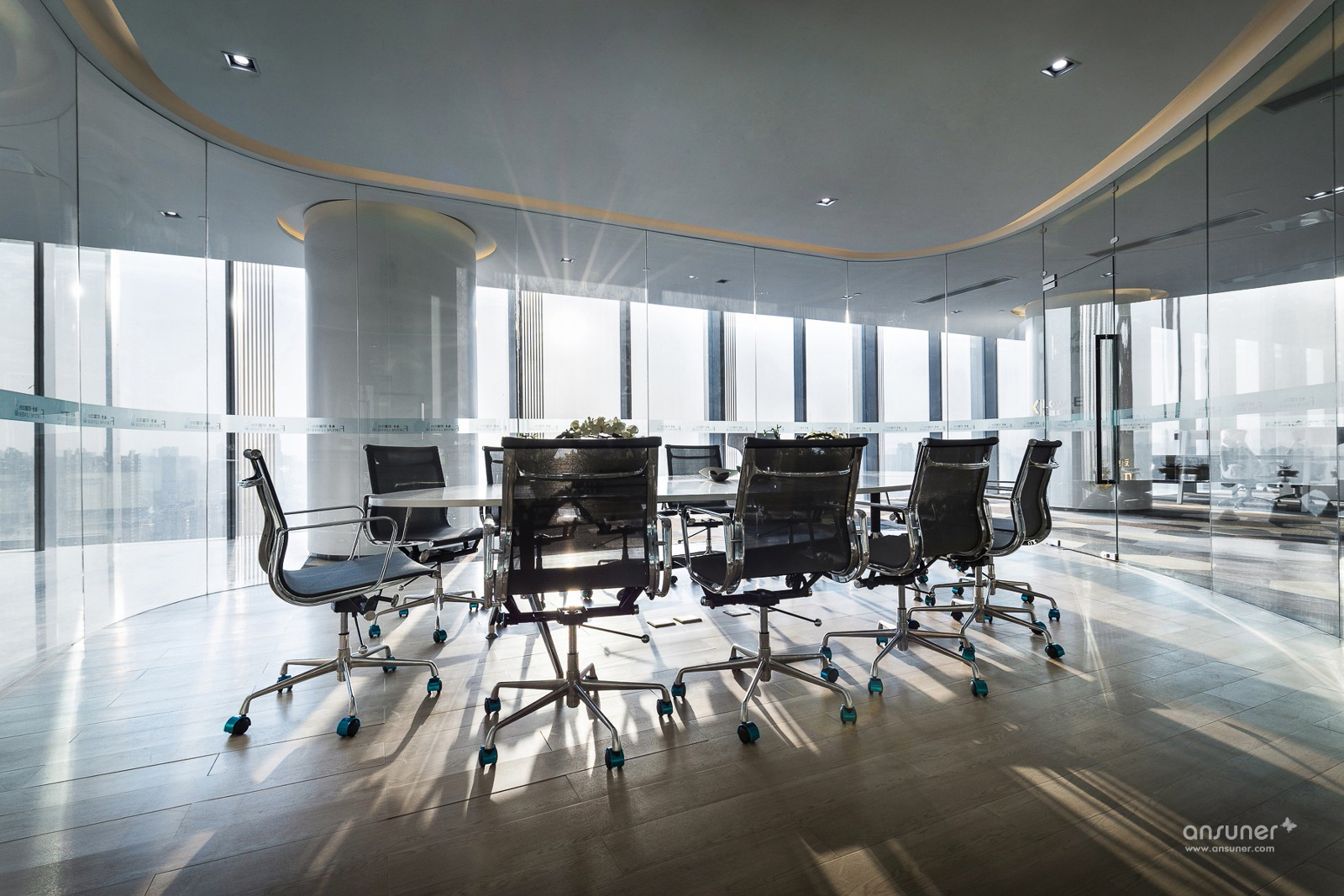 武汉越秀财富中心为华中地区位居第三的高楼,总高330米,地处武汉汉口核心地段,内环线西顶点,承武广,临汉江,居百年大道一中山大道之源。项目位于22楼的办公示范间,为营造一个既开放又相对独立的办公空间,设计以黑、白、灰为主色调,空间以圆弧玻璃划分。