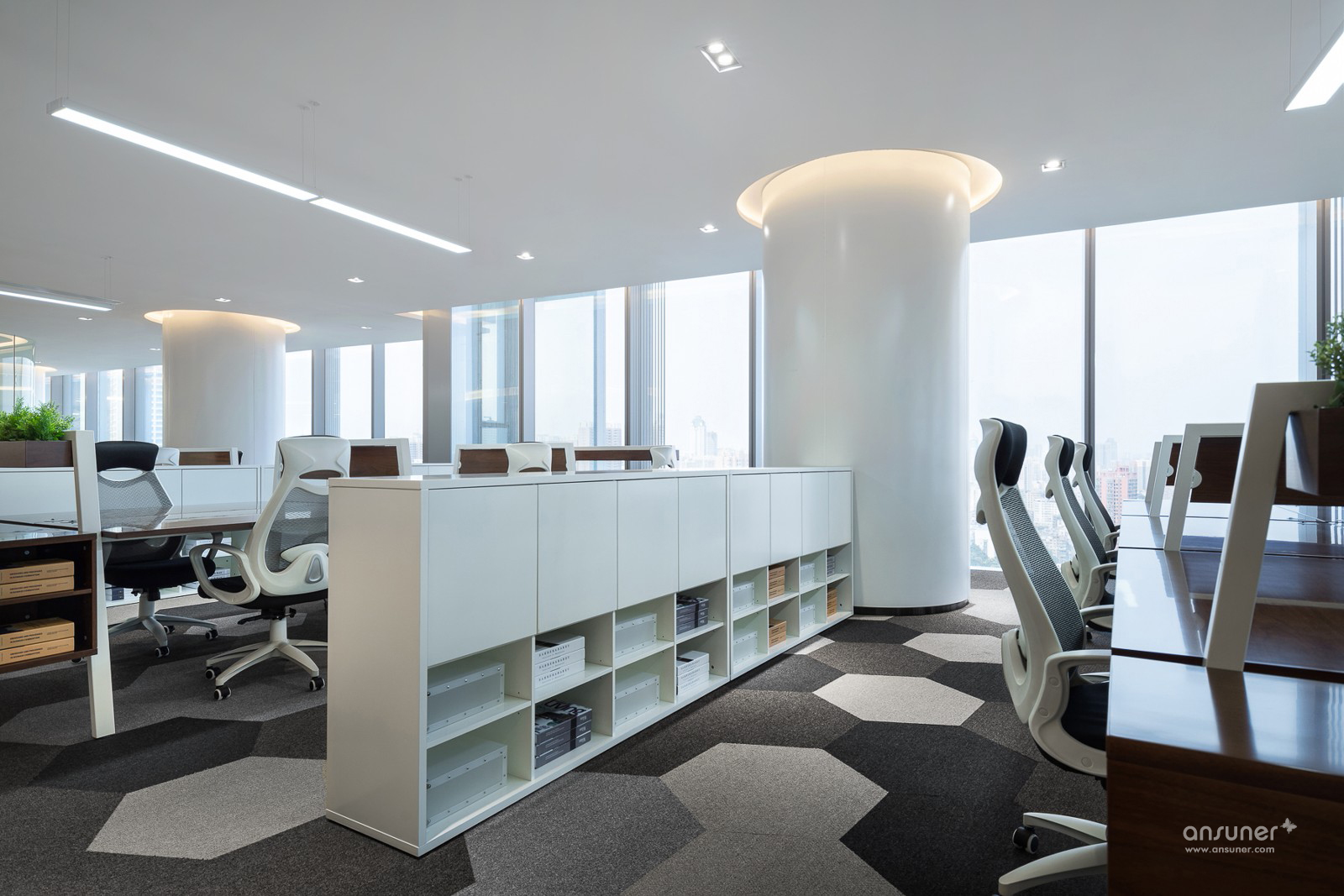 武汉越秀财富中心为华中地区位居第三的高楼,总高330米,地处武汉汉口核心地段,内环线西顶点,承武广,临汉江,居百年大道一中山大道之源。项目位于22楼的办公示 范间,为营造一个既开放又相对独立的办公空间,设计以黑、白、灰为主色调,空间以圆弧玻璃划分。
