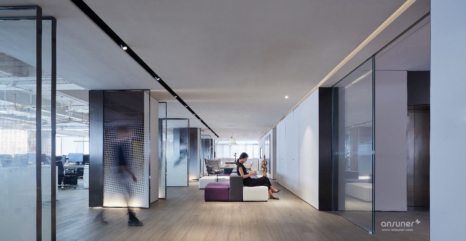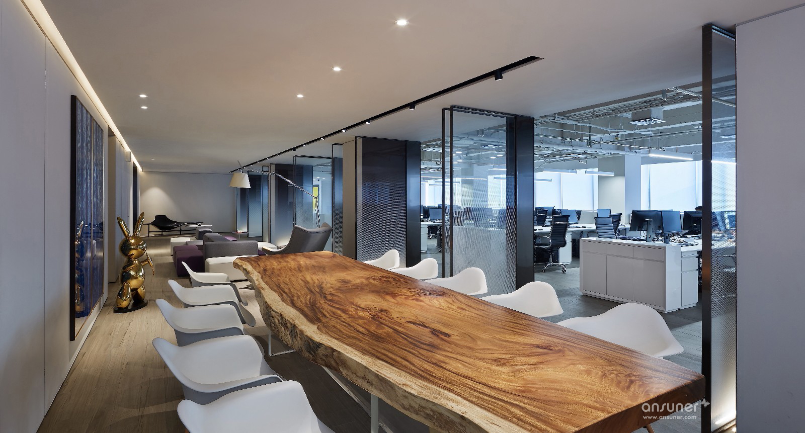 飞视设计之家这种办公组合形式给我们带来了一种开放式的空间体验:在这空间中,室内空间的划分十分灵活,通过家具的组织,形成不同的分区,传统的门厅、走廊、办公室布局已经不复存在,取而代之的,是一个完全开敞式的流动空间。水吧区提供着办公空间基本的管理和服务;大讨论桌除了提供休闲之外,还可以作为共享的会议区使用;休闲区则有着更多的开阔性,除了阅读、休闲还适合两三人的小组工作和讨论;如果你不想被来往的人们所干扰,则可以一头埋进工作站中专注手头的工作……总之,设计师将灵动开敞的空间使用方式代入到了该办公空间中:你可以在这里任意选择最需要的使用空间。