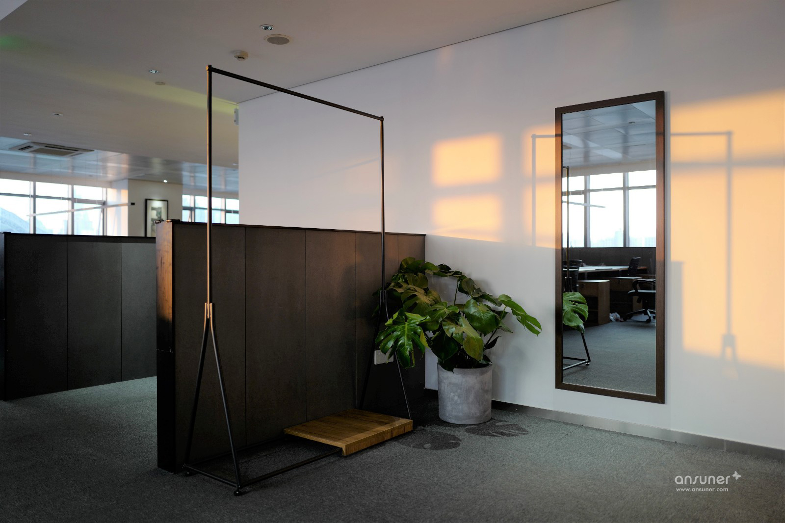 办公空间整体以暖灰色为基调,主材以黑铁、原木、木丝水泥板为主,辅以涂刷本白色乳胶漆的石膏板隔墙、深灰色阻燃块毯,配以4000k色温中性灯光,营造出宁静、平和的办公空间。