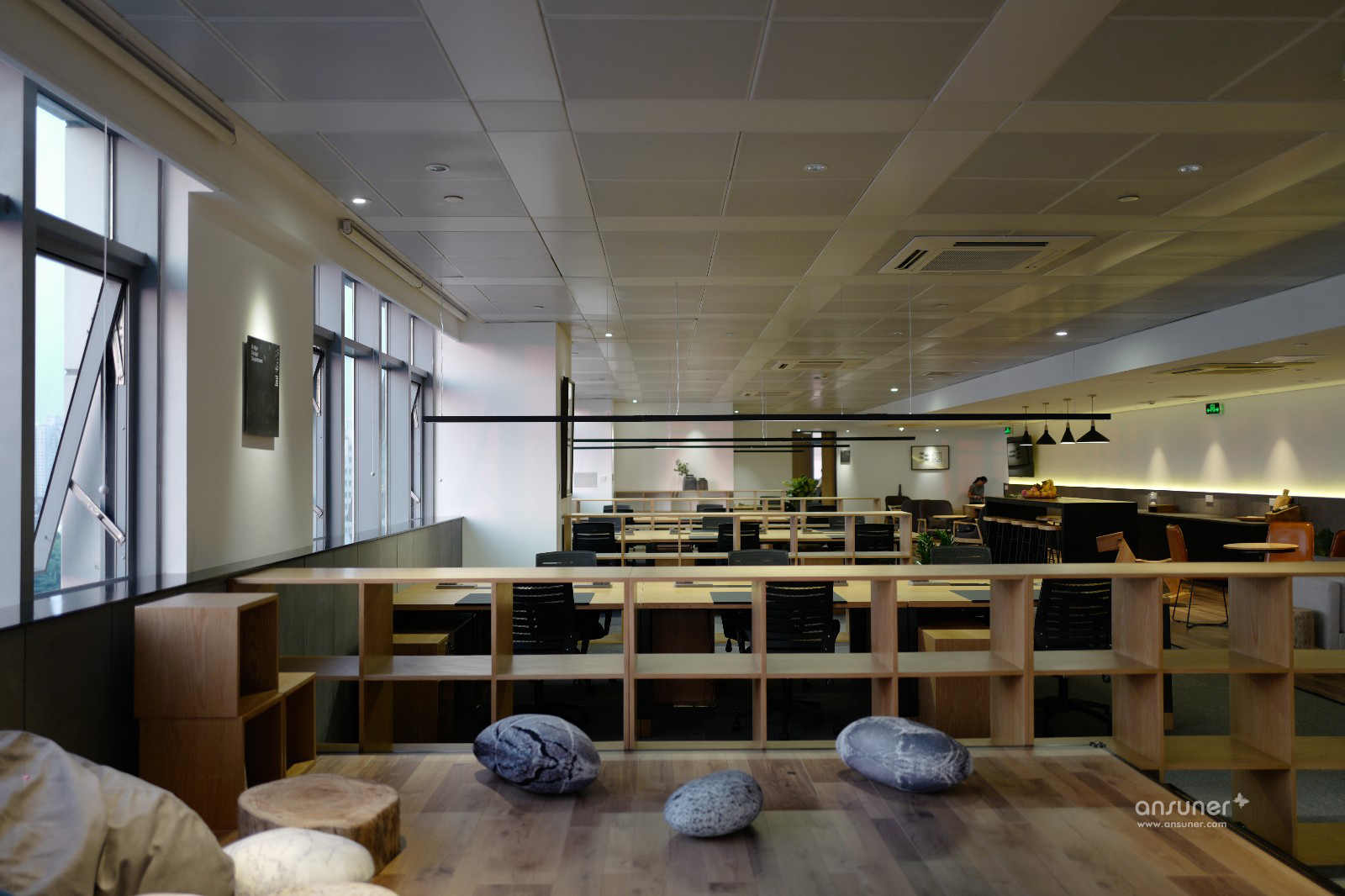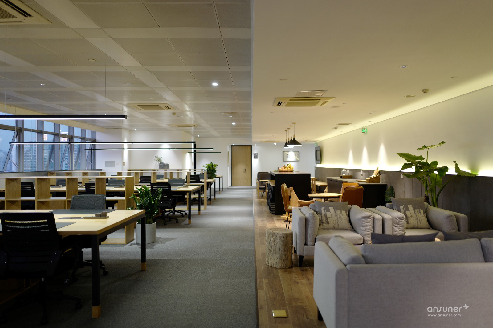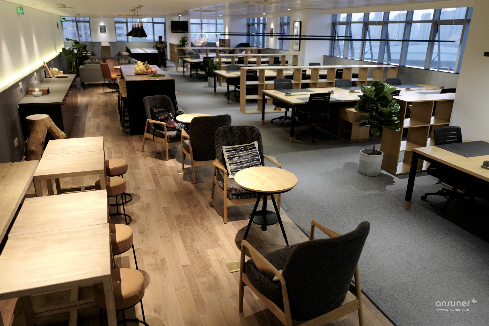 设计师以不同的地台、物料来划分功能区域,用灰色阻燃地毯铺设办公区地面、暖灰色木地板和高台分割出工间休闲区。