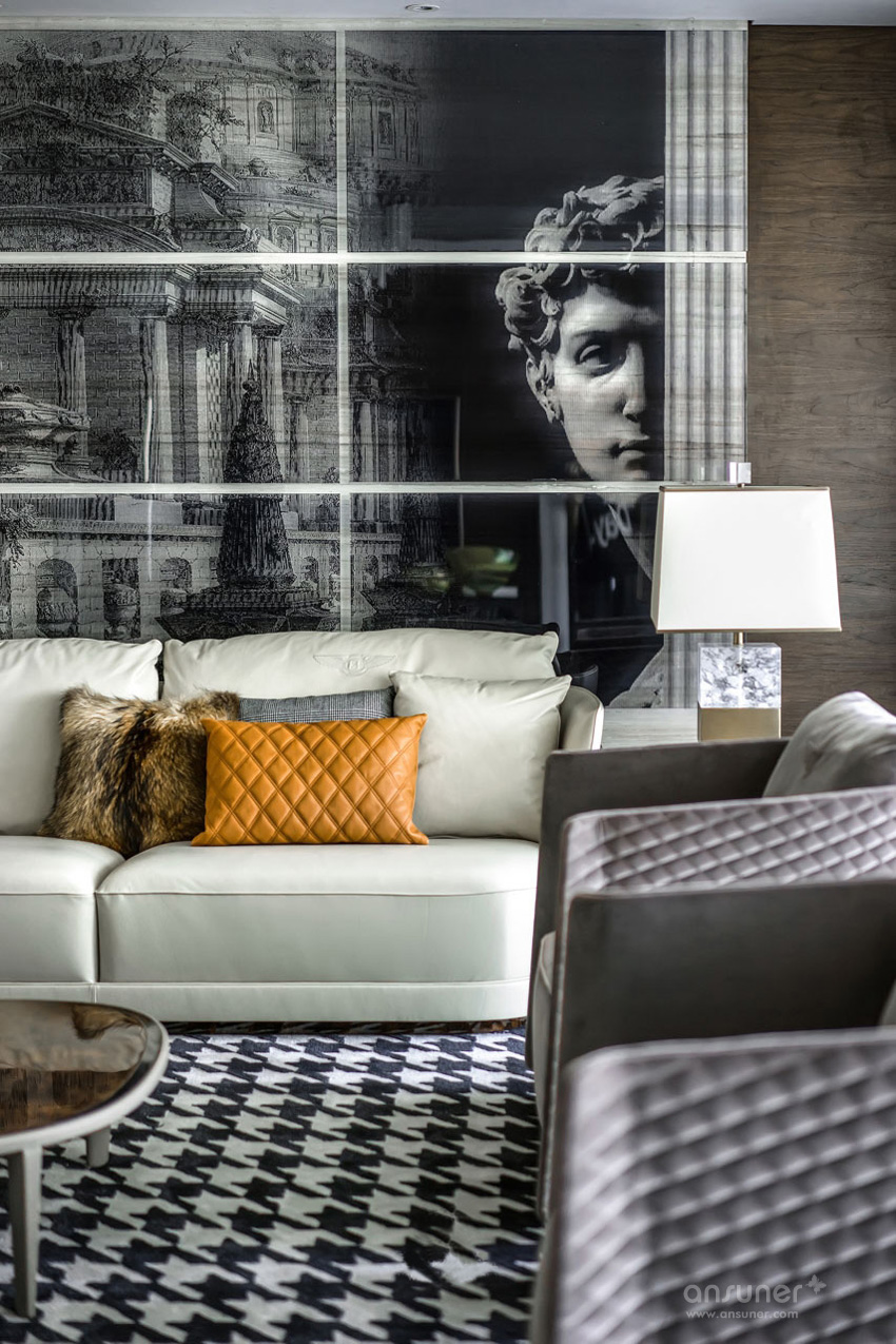 在该套样板间的设计上,设计师延续Bentley Home的低调奢华,却不囿于其中,将古罗马艺术融入其中,运用大卫画与仿旧的古罗马灰壁纸,糅合现代风尚与古罗马艺术。